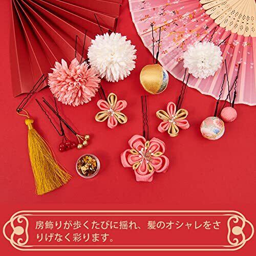 【和装髪飾りセット内容】髪飾13点セット。Uピン仕様の髪飾りは簡単に取り付けられやすいです。ピンは曲げることも出来ます。小さめのものを複数付けて、どの方向から写真を撮っても映えるようにするのも可愛いですね。綺麗に梱包しますので、新年、誕生日、クリスマス、バレンタインデーギフトとしてお勧めます。浴衣や着物などの和服だけでなく、普段使いにも便利な一本タイプです。