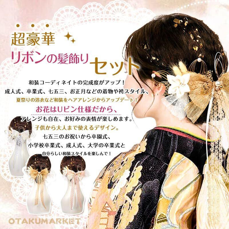 【リボン髪飾り用途】リボンの髪飾りセットです。成人式の髪飾りは前撮りに最適。夜会巻き、アップヘア、サイドアップ、お団子、編み込みなど人気のまとめ髪の補助やアクセントにオススメです。大人の方は結婚式、パーティー、謝恩会、成人式、卒業式など華やかなお席の和装、振袖姿や浴衣のコーディネートにぴったりします。お正月、お祝い事、七五三、卒園式などにオススメです。