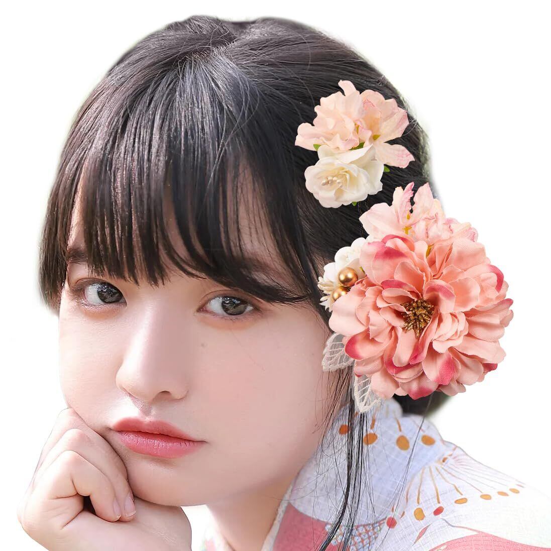 【用途】お花の髪飾りです。成人式の髪飾りは前撮りに最適。夜会巻き、アップヘア、サイドアップ、お団子、編み込みなど人気のまとめ髪の補助やアクセントにオススメです。子供さんは卒園式・七五三・お正月・お祝い事・桃の節句などにオススメです。大人の方は結婚式・パーティー・謝恩会・成人式・卒業式など華やかなお席の和装、振袖姿や浴衣のコーディネートにぴったりします。