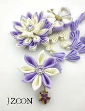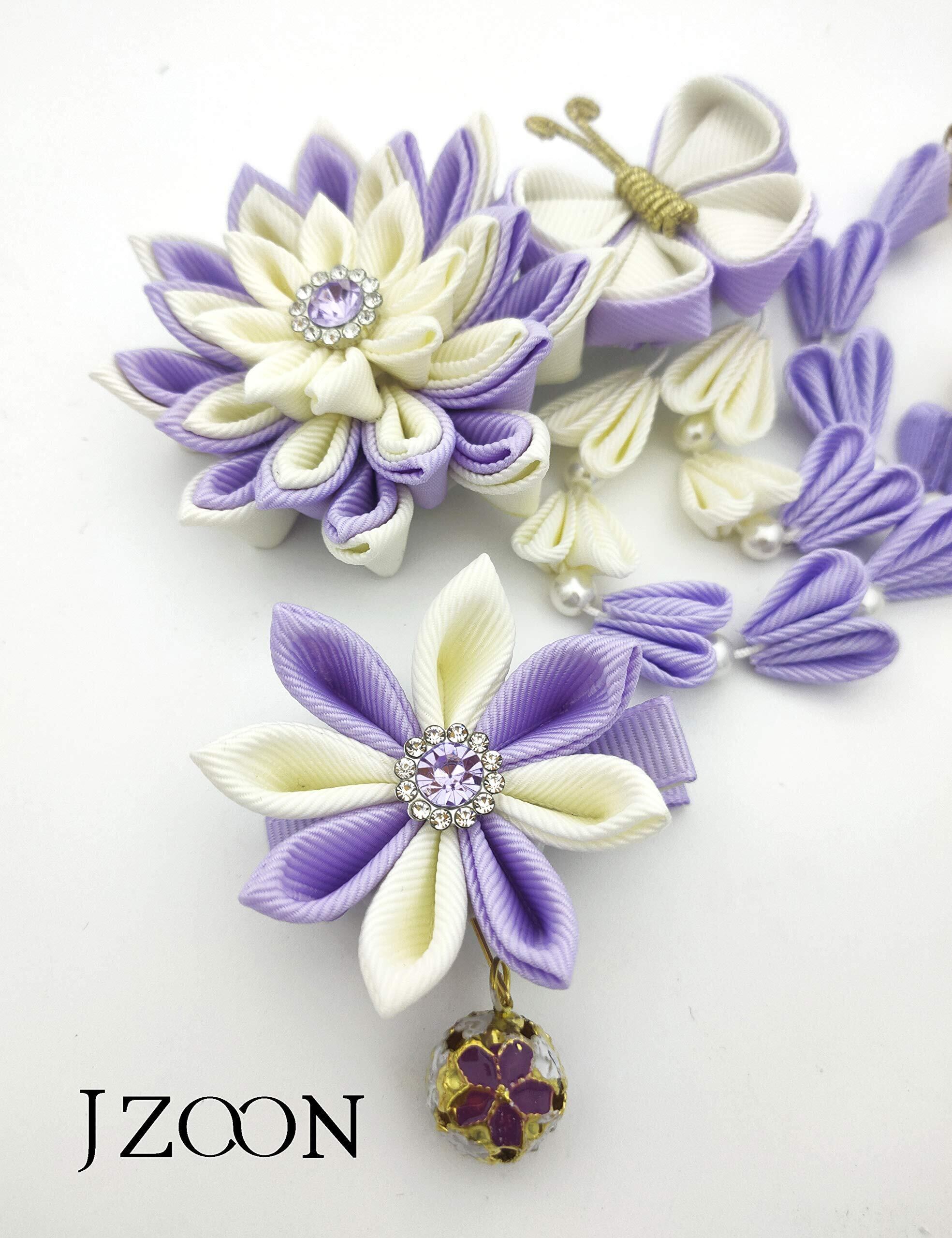 [JZOON] 髪飾り菊桜蝶 3点セット つまみ細工 成人式 七五三 浴衣 袴 着物 振袖 和装 花 卒業式 結婚式 鈴付き 手作り 赤 青 紫 ピンク 4色 菊 桜 蝶 全12選