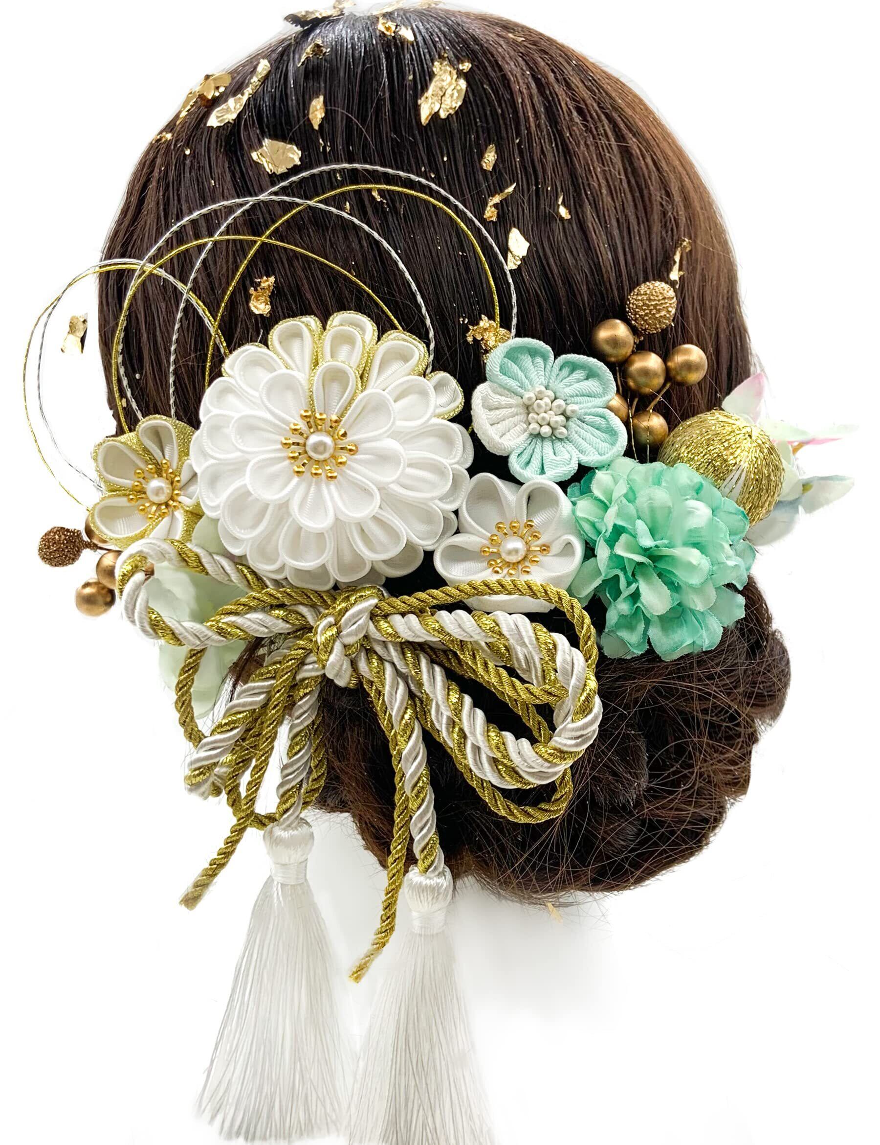 ⁂デザイン:高品質の縮緬生地で手作ったピンポンマムや小花の髪飾りは和服と合わせて高級感、華やかな印象をお顔周りに与えてくれます。