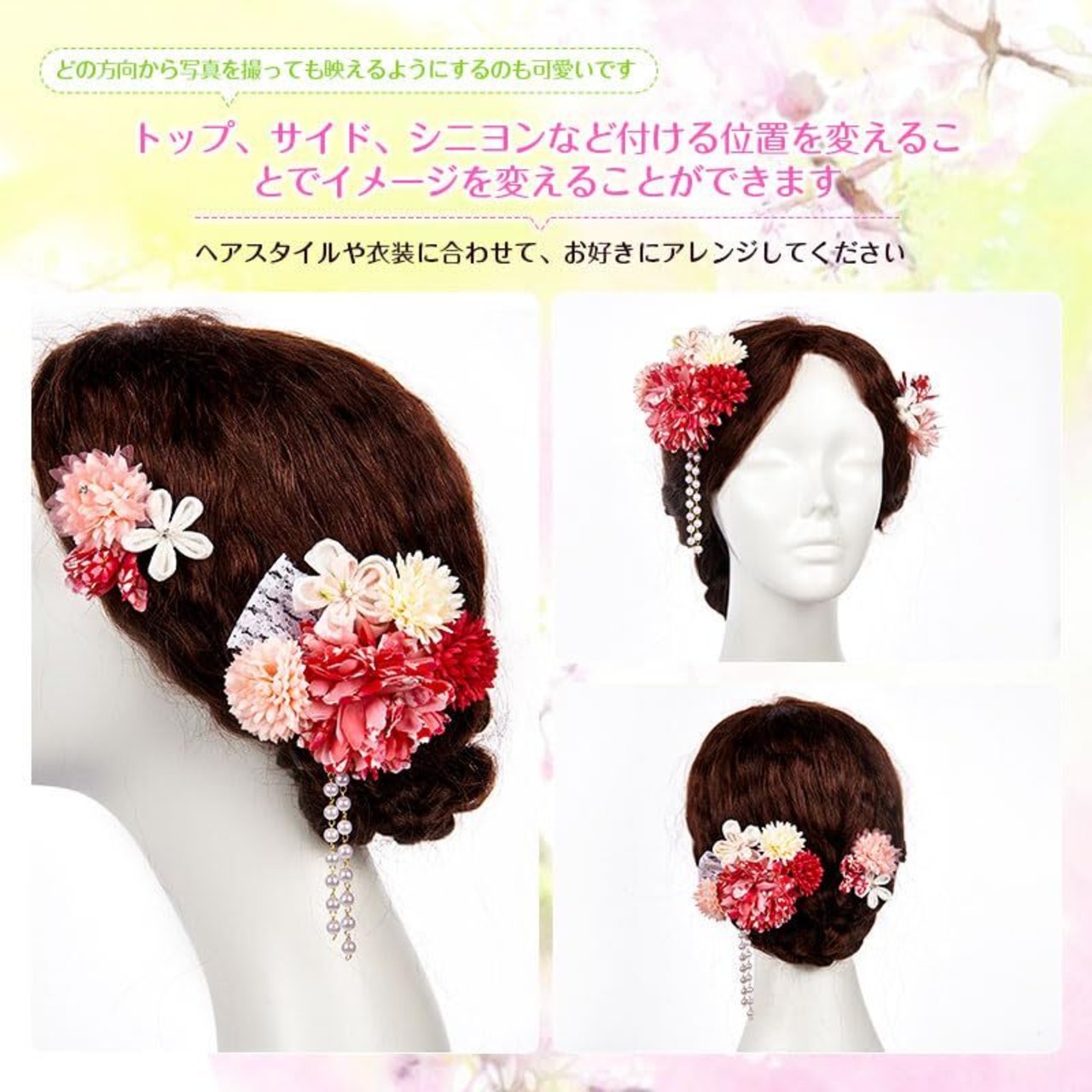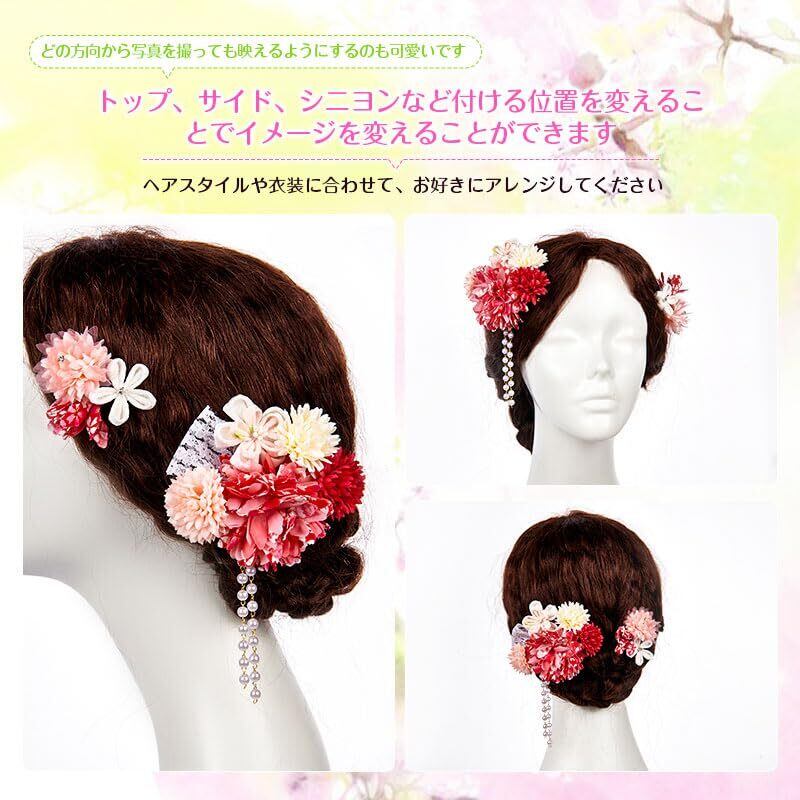 【用途】お花の髪飾りです。成人式の髪飾りは前撮りに最適。夜会巻き、アップヘア、サイドアップ、お団子、編み込みなど人気のまとめ髪の補助やアクセントにオススメです。子供さんは卒園式・七五三・お正月・お祝い事・桃の節句などにオススメです。大人の方は結婚式・パーティー・謝恩会・成人式・卒業式など華やかなお席の和装、振袖姿や浴衣のコーディネートにぴったりします。