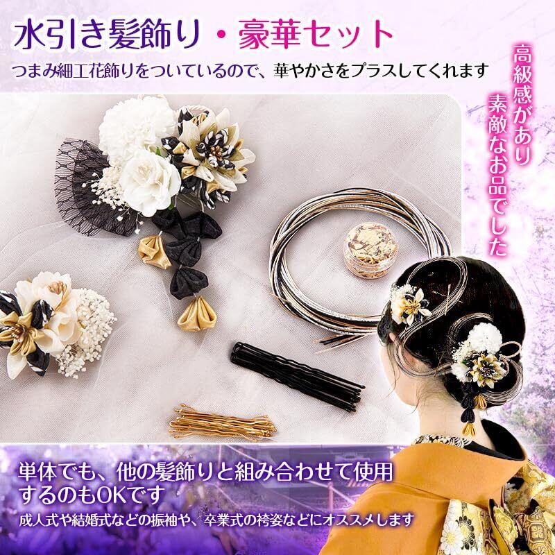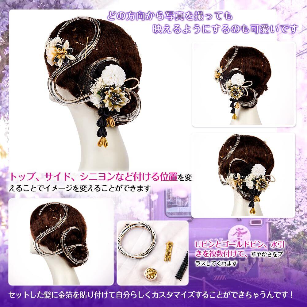 [OTAKUMARKET] 成人式 髪飾り 振袖 水引き つまみ細工 花 袴 着物 和装 卒業式 浴衣 結婚式 髪 飾り コーム 24点 ヘアアクセサリー 金箔 ピン 付き 2カラー (黒白) | Bloomia