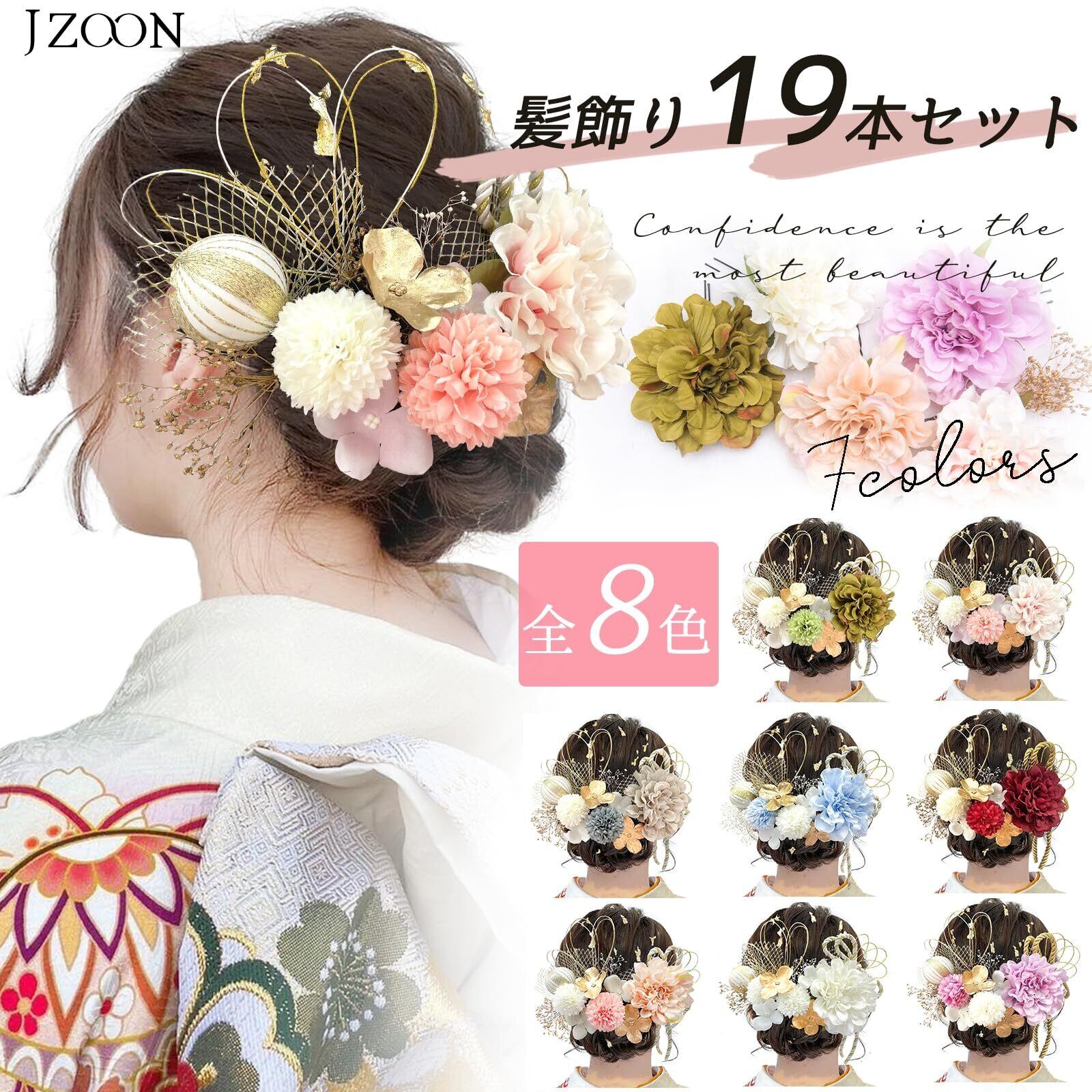 【嬉しい多色展開】厳選された素材がたっぷり、お手作りしたJZOONの髪飾りです。人気な色がたくさん揃っており、レッド、パープル、ピンク、グレー、シャンパン、オリーブグリーン、ホワイト、ブルー全8色を、ハレの日のお服や気分に合わせて、ご自由にお選びいただけます。