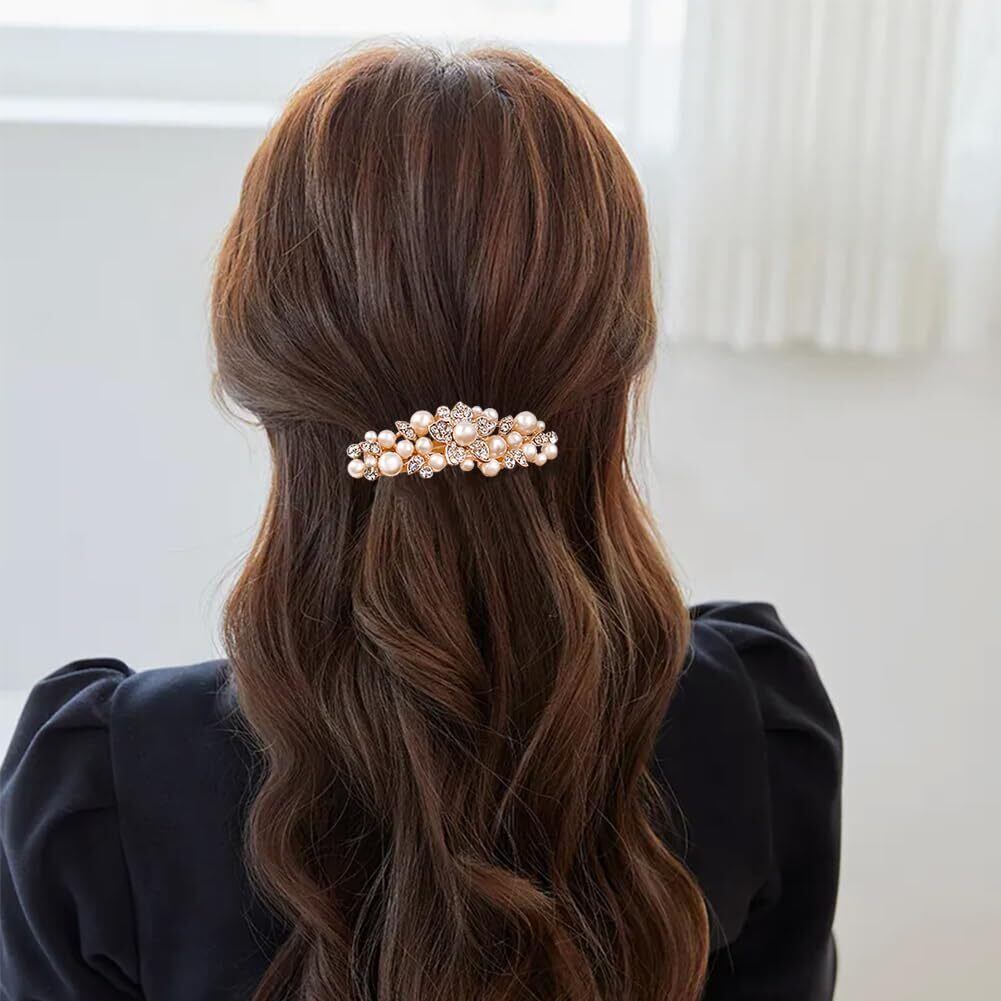 バレッタタイプなので簡単に髪に止まります。 時間のないお出かけ前にサッと付けるだけでいつものヘアアレンジをぱっと華やかでオシャレに演出してくれます。