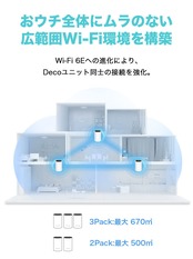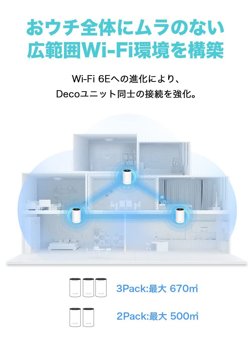 [特徴] Wi-Fi6Eで新たなメッシュWi-Fi環境を構築。新規格 6GHzにより、新次元のメッシュWi-Fi環境を体感。既存のDecoとの併用も可能。
