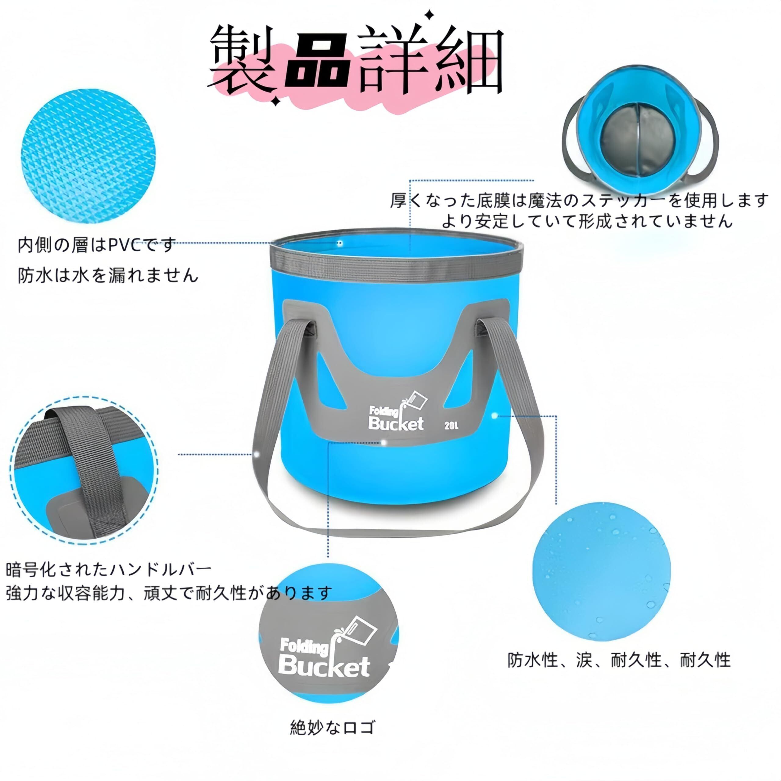 【バケツ仕様】容量:12L サイズ:24*25cm 収納サイズ:26*11cm。容量:20L サイズ:27*30cm 収納サイズ:30*12cm。耐熱範囲:-20℃~80℃ 持ち運び 畳めるデザイン。