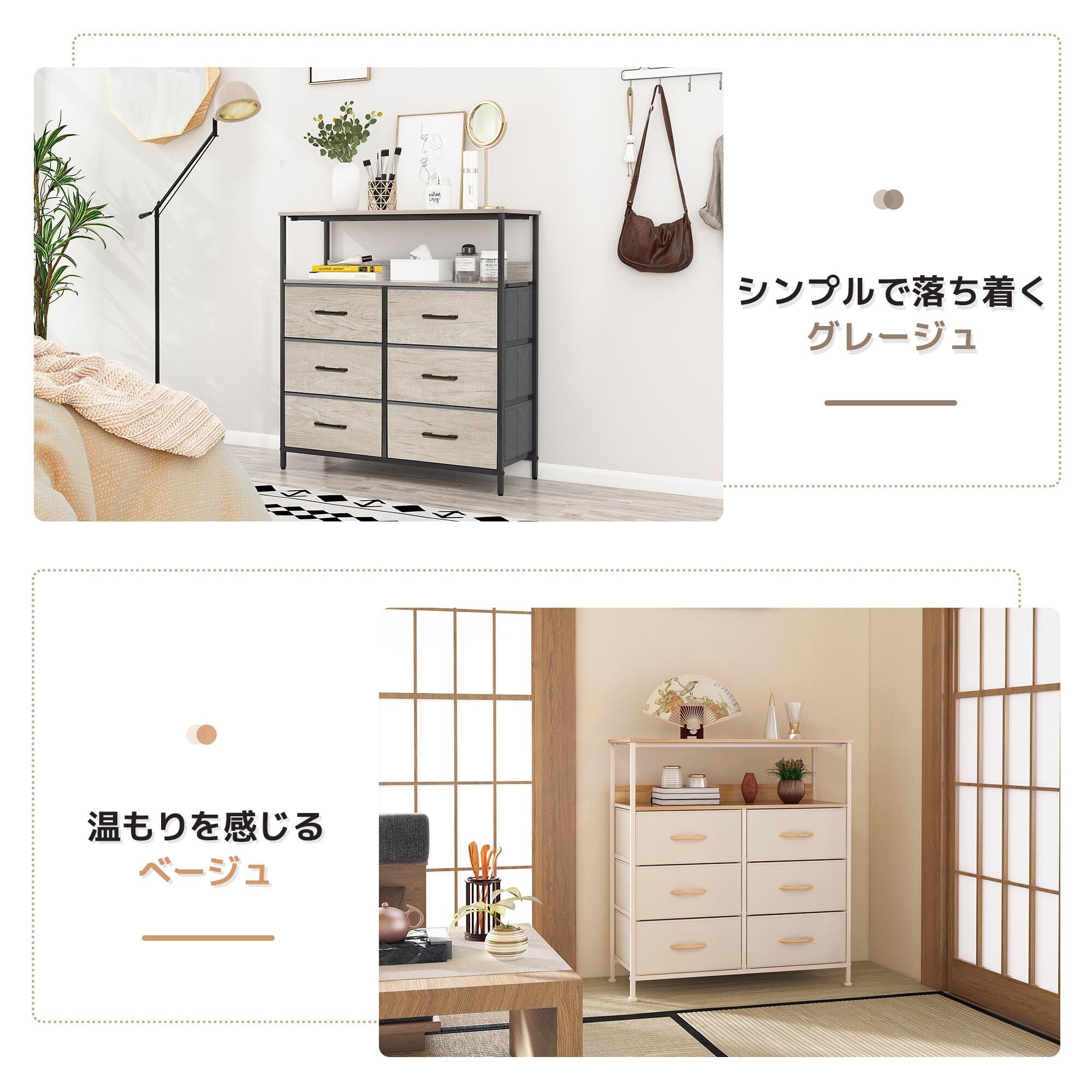 LYNCOHOME 棚付き収納チェスト グレージュ タンス キャビネット 布製引き出し 衣類収納 リビング収納 低ホルム 北欧風 3段6杯【幅80×奥行30×高さ84cm】