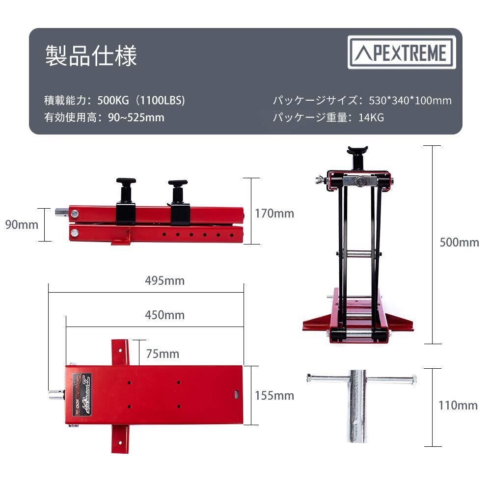 Apextreme バイクジャッキ バイクリフト リフトジャッキ 耐荷重500kg 安全ストッパー付き アタッチメント付き ハンドル付き レッド