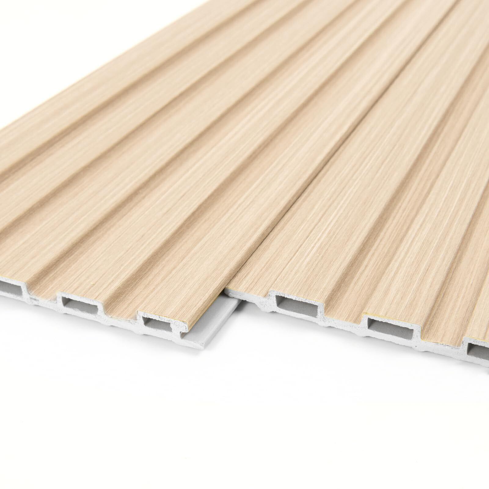 環境に優しい - エコフレンドリーなウッドスラットパネル 私たちのウッドスラットパネルは、リサイクル可能なプラスチックと木材繊維を使用し、環境に配慮した製品です。防水性、防火性、汚れ防止、ホルムアルデヒドフリーの特性を備えており、清掃も簡単で室内使用に最適です