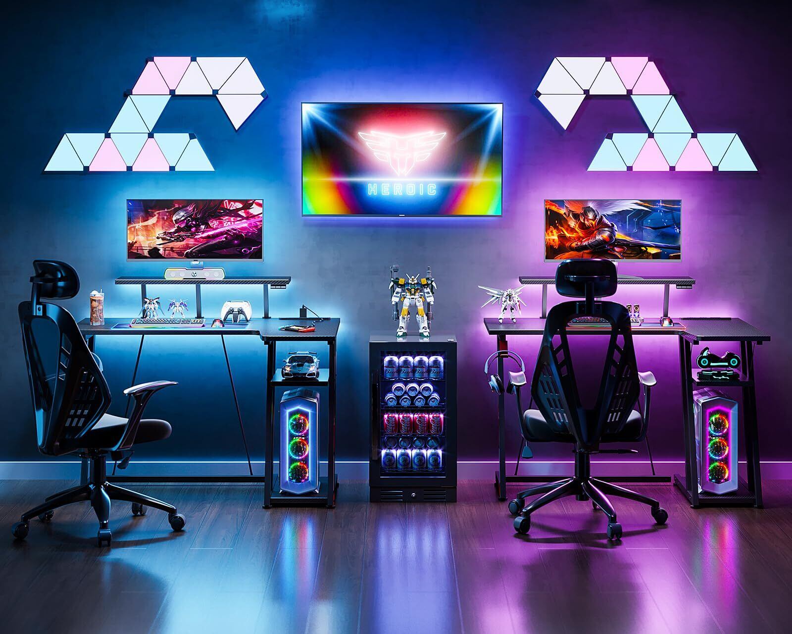 【LEDライト付きのゲーミングデスク】搭載されたRGB変色LEDライトは8種のモードと8つのカラーを設定できるため、ゲームセ雰囲気をより高められます。滑らかな手触りのカーボンファイバー製テーブルトップと相まって、ゲーム体験を大いに盛り上げてくれます。