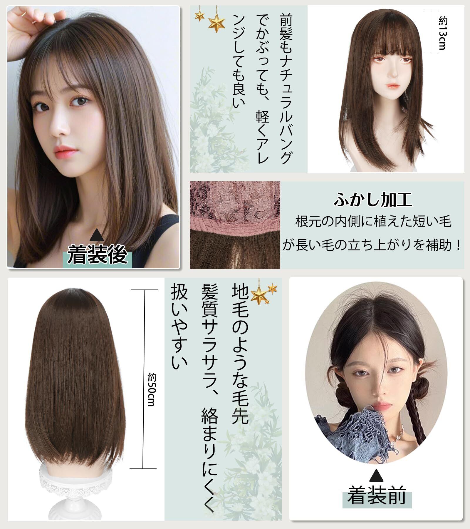 仕様:前髪:12cm 後ろ髪:つむじから約55cm フリーサイズ (頭周り:53cm-59cm サイズを調節できるアジャスター付き)
