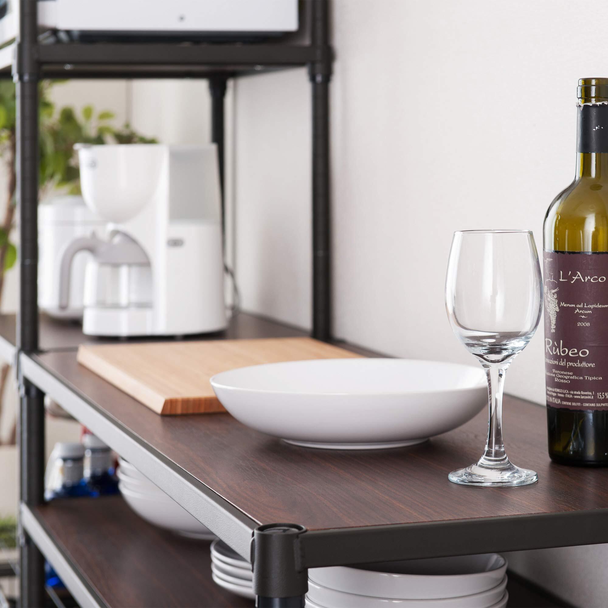 ウッドシェルフは「ウォールナット調」の木目を仕様。フレームのハンマートーンと調和して、ビンテージ感のある仕上がりに。