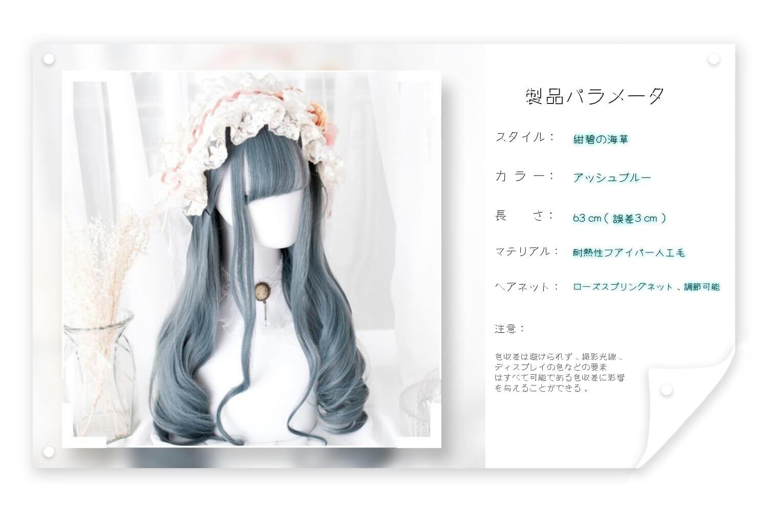 Sizuuenn 女性用 ロリータ レディースフルウィッグ ロングヘア カール ぱっつん前髪 ブルー ウィッグ 「紺碧の海草」 アッシュブルー 耐熱ウィッグ 高温ヘア糸 コスプレかつら 専用ネット イベント 学園祭 文化祭 撮影用 変装用 | Bloomia