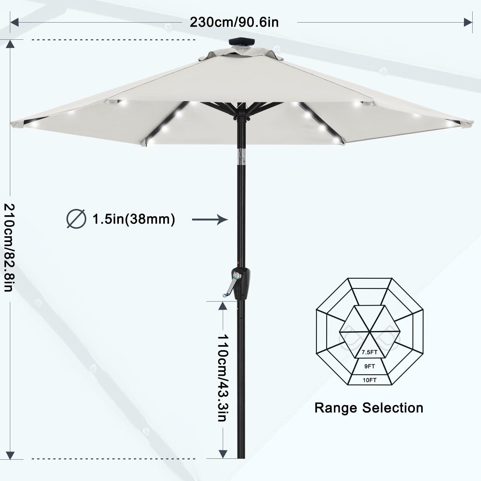 便利な機能:24個のソーラーライトがつけられ、航続時間が9-12時間に達します。スイッチボタンで照明をコントロールすることができます。上にある太陽電池パネルは太陽エネルギーで動くバッテリーを採用し、充電コードは必要ありません。省エネで便利!また、パラサルの開け閉めにはハンドル回転式を採用し、力に自信のない方でも気軽くに使用できます。チルト機能も付いているので、日差しの向きによってパラサルの角度を変えられます。