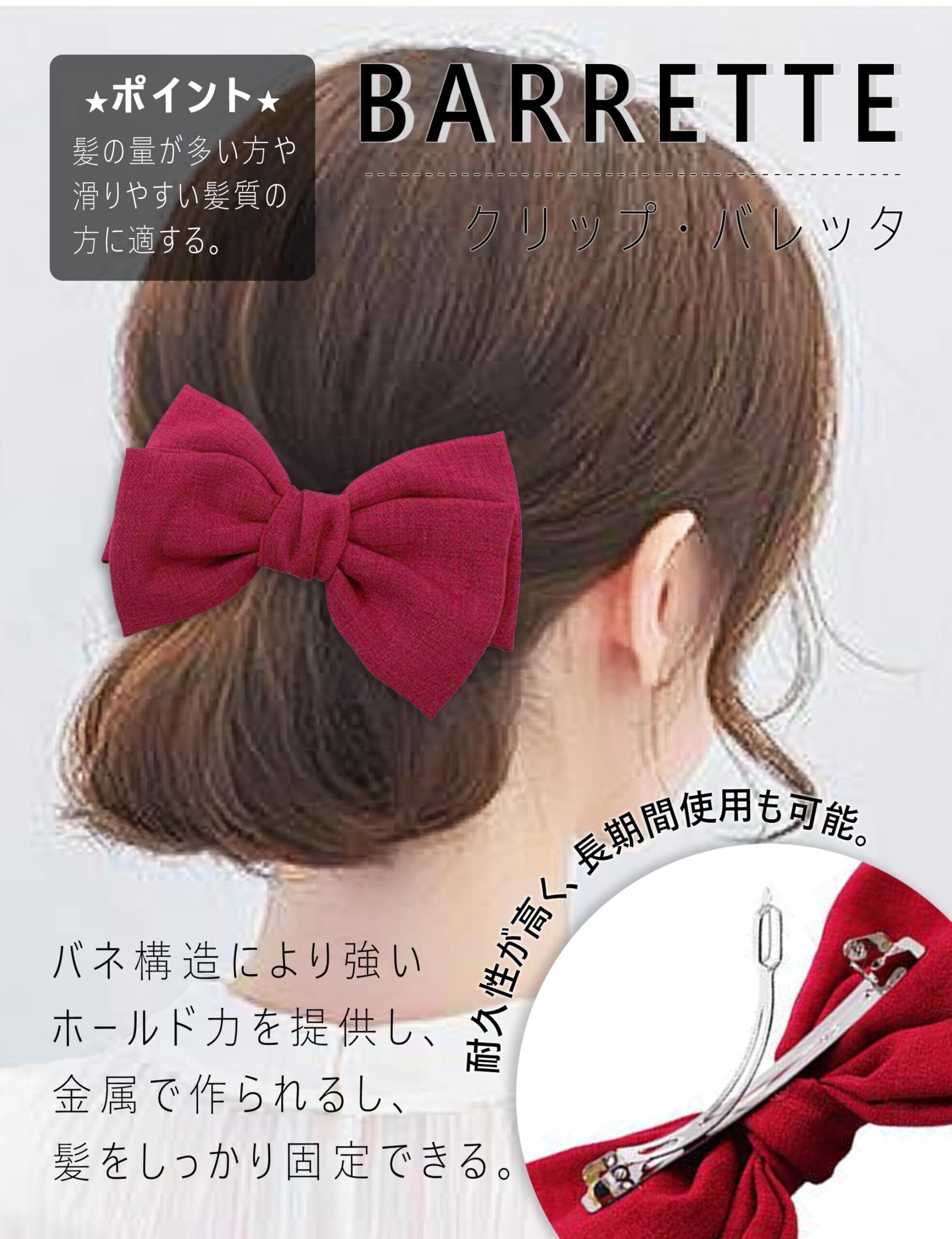 シンプルなリボンですが、付ける位置でも雰囲気を変えてお使いいただけます。華やかなヘアスタイルを演出するのにぴったり。ハーフアップや、ヘアゴムで一つにまとめ、その上からバレッタをのせても結び目が隠れるので可愛くスッキリとまとまります。