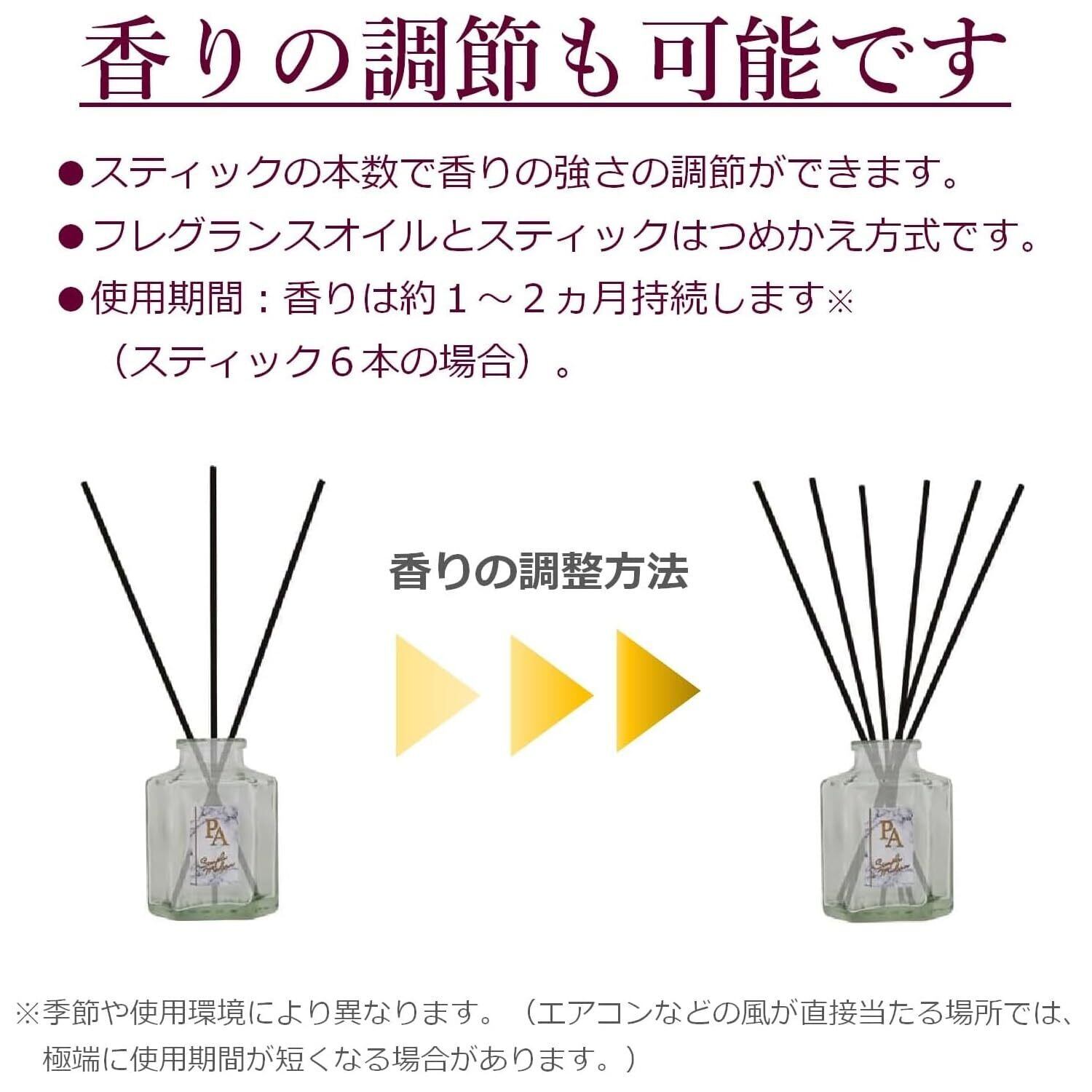 スティックの本数で香りの強さの調節が出来ます。通常約1~2ヵ月持続します(スティック6本の場合)。