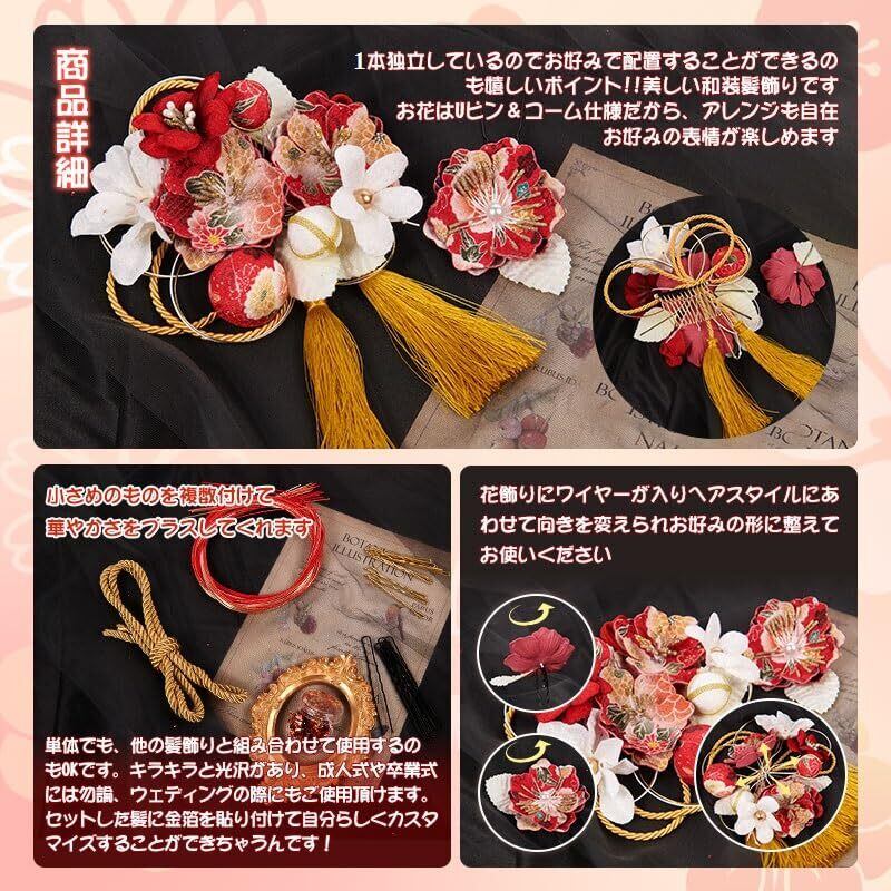 【和装髪飾りセット内容】花飾り2点+水引き長さ90cm*15本入+Uピン10本+ゴールドのピン10本+赤金箔1個 セット。綺麗に梱包しますので、新年、誕生日、クリスマス、バレンタインデーギフトとしてお勧めます。浴衣や着物などの和服だけでなく、普段使いにも便利な一本タイプです。