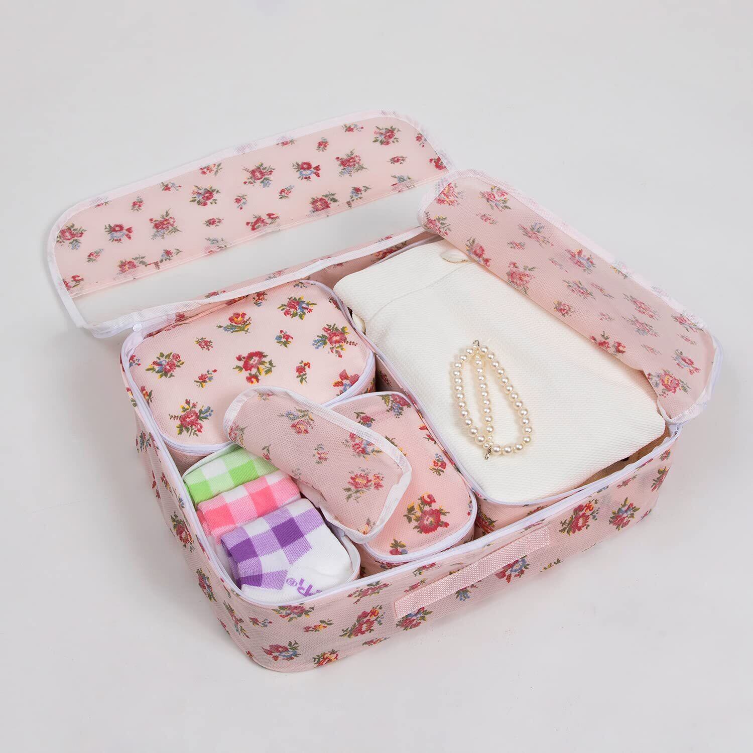 アストロ バッグインバッグ 薄ピンク 花柄 5個セット 収納ケース トラベルポーチ 小物入れ パッキング 822-66
