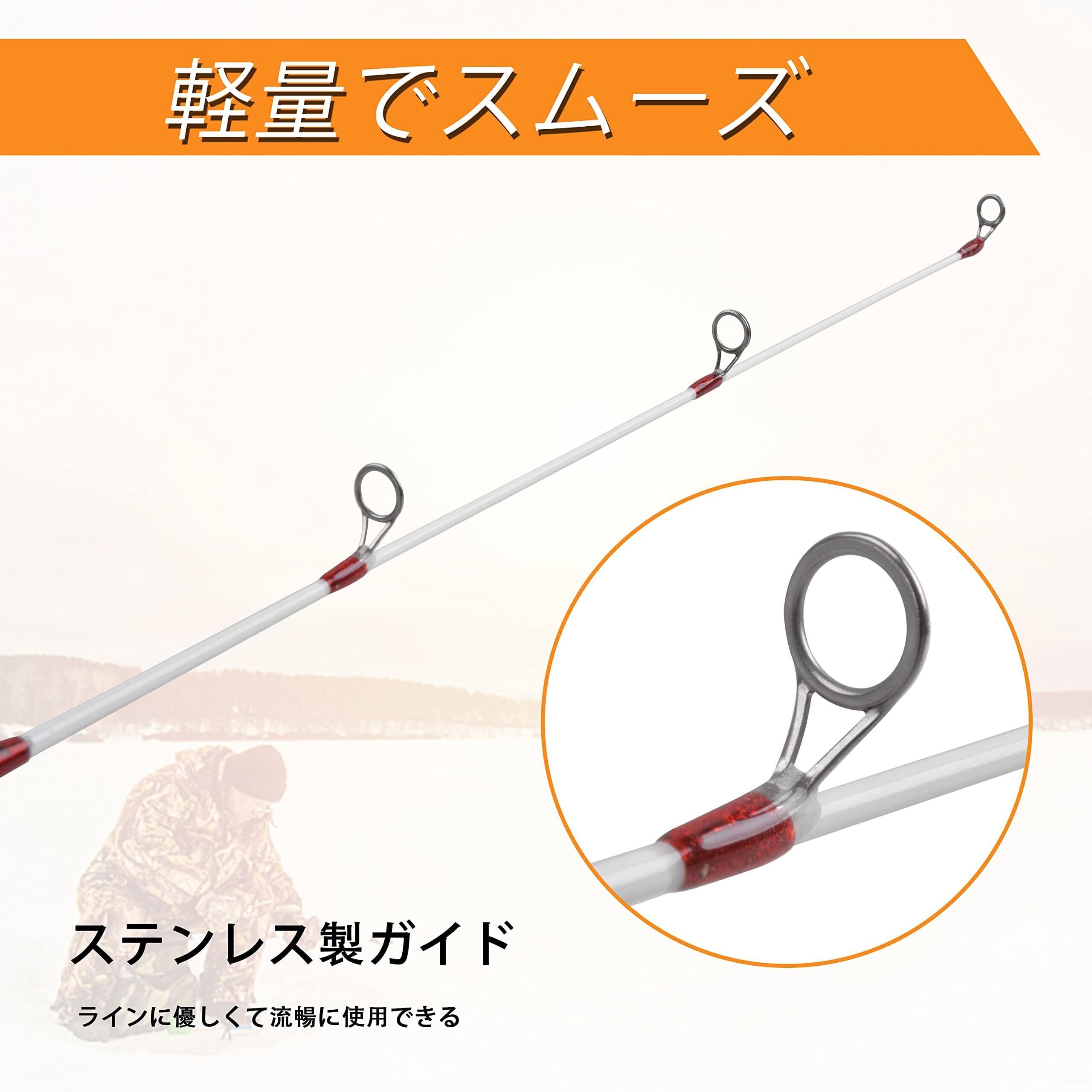 穴釣り竿仕様:展開時全長:約59cm(±1cm)収納時約38cm/分割時:ハンドル部:22cm 元竿:約38cm / 標準自重:113g / 継数:2 / ガイド数:3+1 耐久素材:滑り止めと快適なグリップのためのお洒落な木目調ABSハンドル、透明ペンキを塗るので、カビがはえなくて劣化しにくいです!ABSリールシートとステンレスジョイントだから高耐久です。