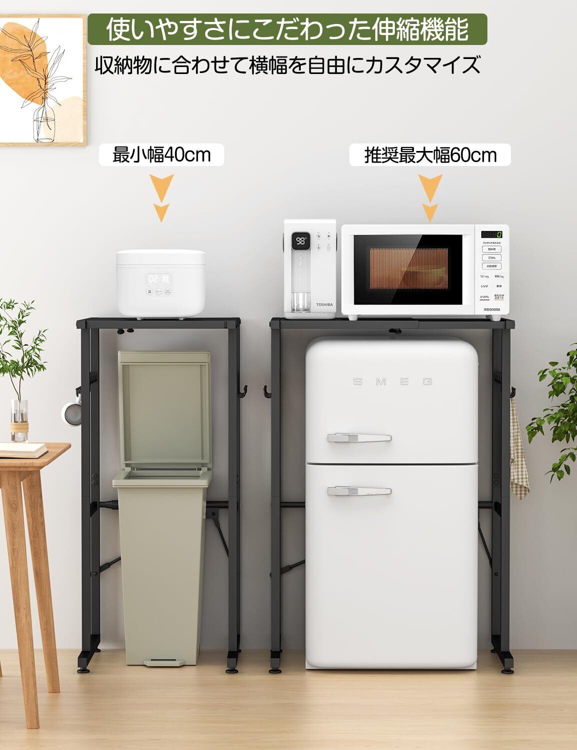 Holdm ゴミ箱上ラック レンジラック スチール 伸縮 40-60×奥行40×高さ86.5cm 耐荷重25㎏ フック8個付 アジャスター付き レンジ台ラック 冷蔵庫上ラック (ブラック) | Bloomia