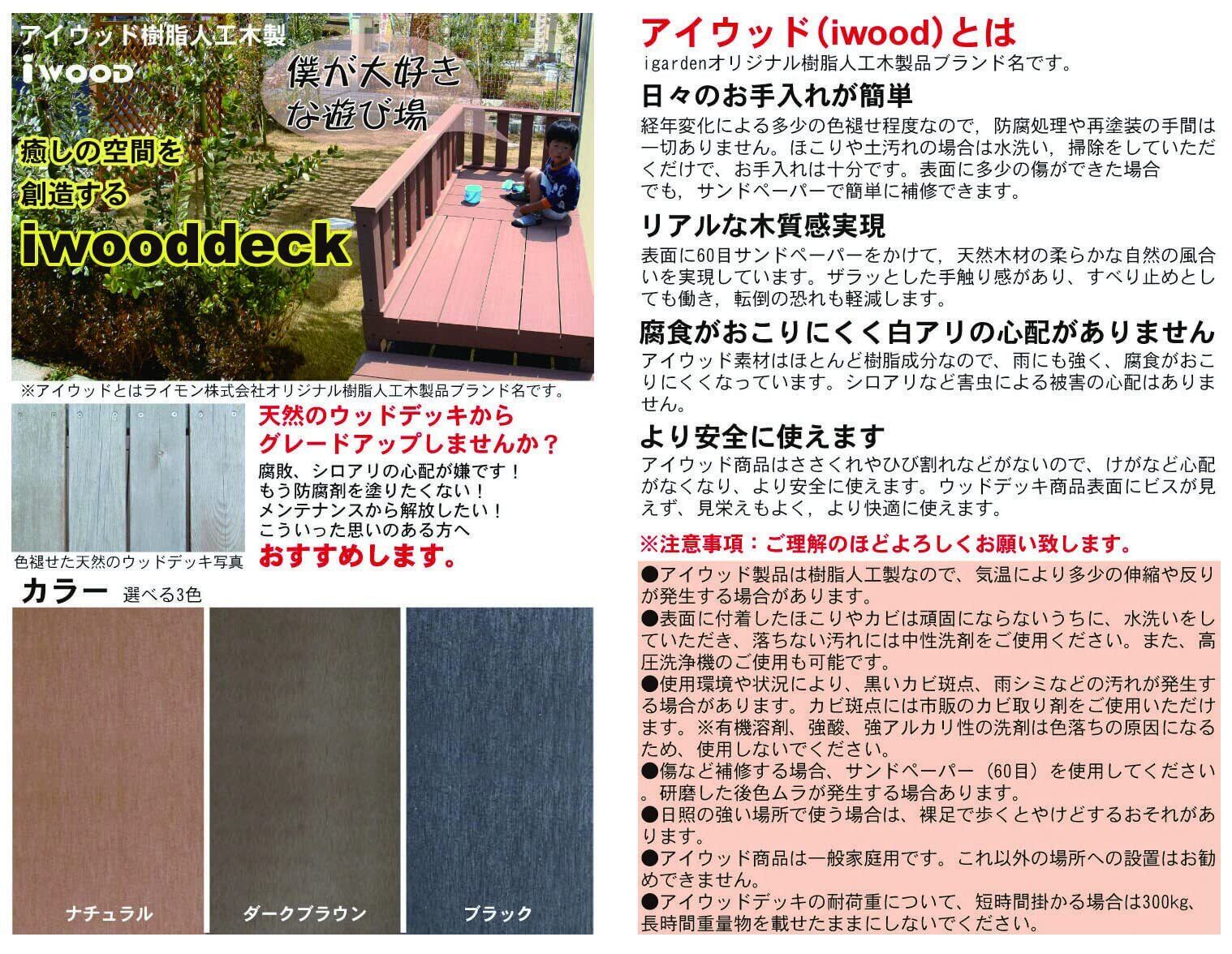 アイウッド(iwood)は素材のほとんど樹脂成分(90%以上)なので、雨にも強く、腐食がおこりにくくなっています。
