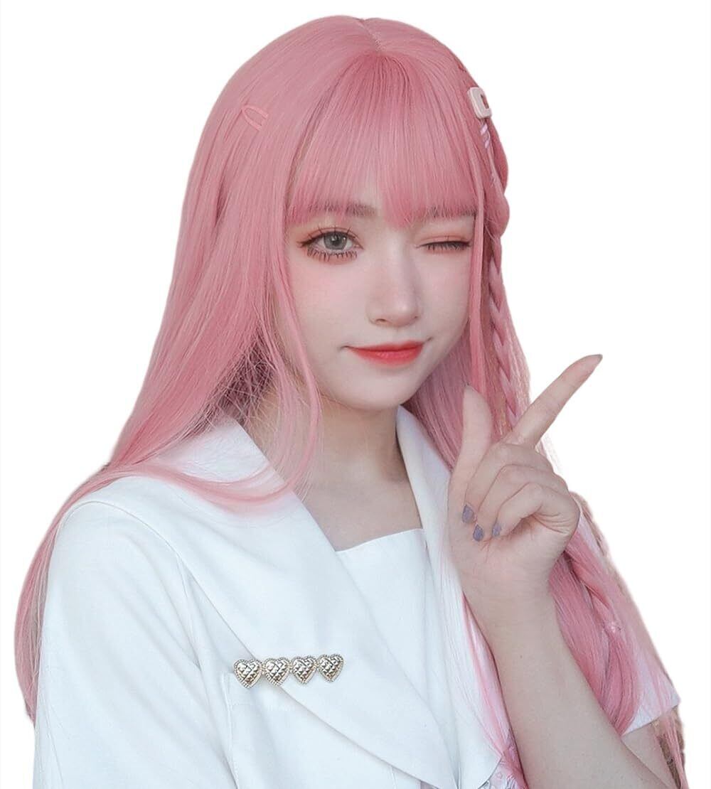 Sizuuenn 女性用 かつら ロングストレート ぱっつん前髪 ピンク ウィッグ 「さくらガール」 小顔 耐熱ウィッグ 高温ヘア糸 コスプレかつら 専用ネット イベント 学園祭 文化祭 撮影用 変装用 | Bloomia