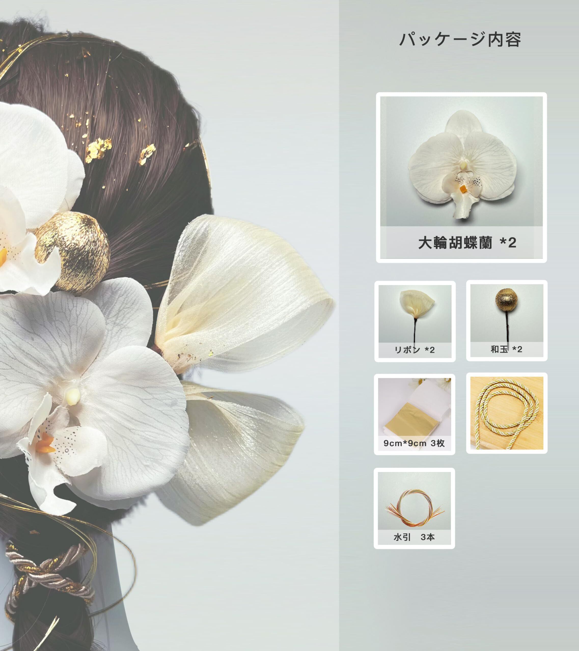 髪飾り 大輪 胡蝶蘭 2輪 白無垢 和装 袴 着物 浴衣 振袖 卒業式 成人式 結婚式 和紐 とリボンと 水引 金箔 人気 ブライダル 花嫁 ロープ ゴールド シルバー ヘアアクセサリー | Bloomia