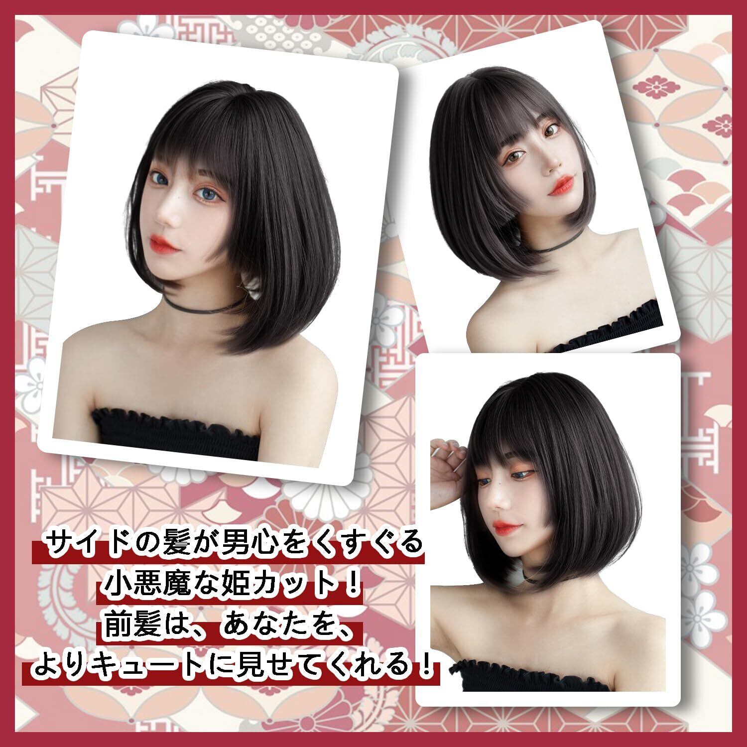 FESHFEN ウィッグ ボブ ショート 姫カット フルウィッグ かつら 姫髪 レディーズ ストレート 自然 ハロウィン 小顔 原宿系 ロリータ ぱっつん前髪 日常 耐熱 黒髪 真っ黒 ナチュラルブラック | Bloomia