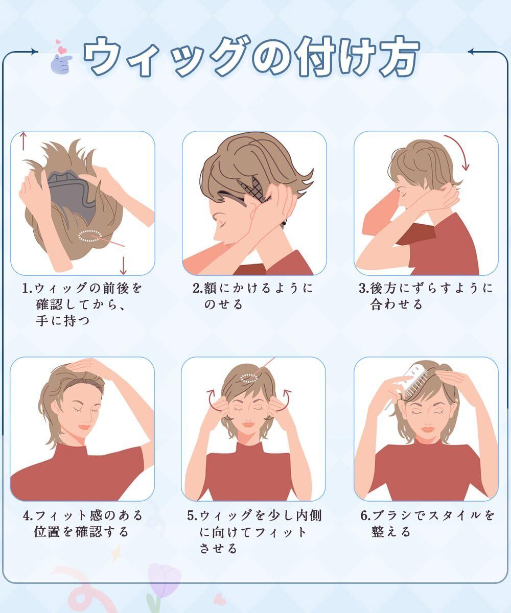 【ウィッグ素材】①高品質ファイバーを採用してウィッグの特別なテカリがないです。髪質がサラサラし、絡みにくくて簡単にカットし、本物のように違和感ないです。 ➁160 ℃までより高い耐熱性のあるファイバーを使って、カットも、コテ、アイロン、ドライヤーで好みの髪型に整えることもできます。 ➂地毛より良い静電気に抑制効果がある。