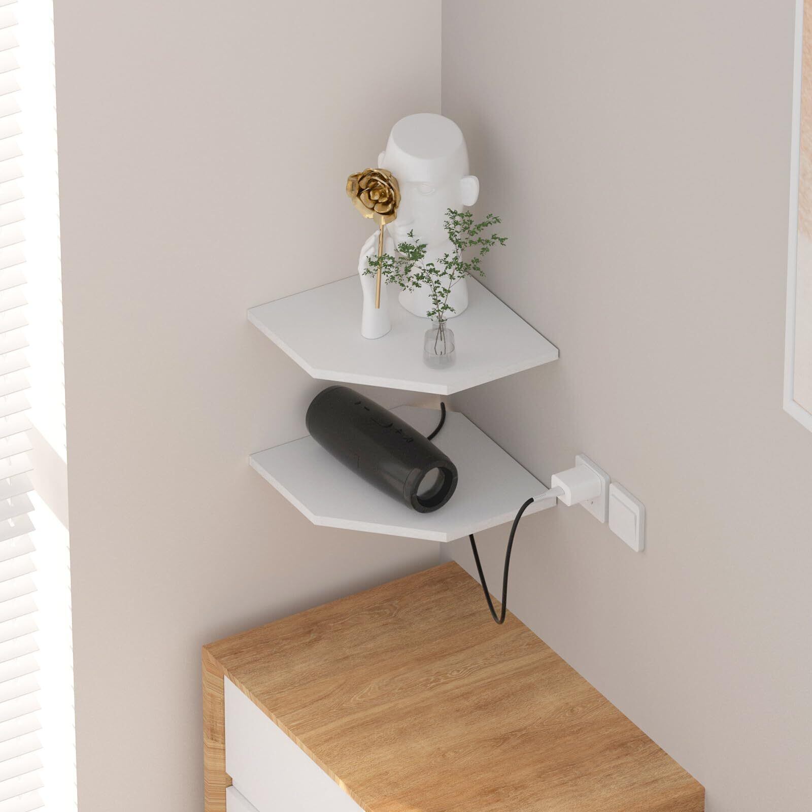 JJLコーナーシェルフ 壁掛け、線穴付き壁コーナー棚、2枚セットで壁角の装飾と収納機能に使用され、寝室の壁装飾によく使用され、室内の壁角装飾(42.4cm ホワイト)