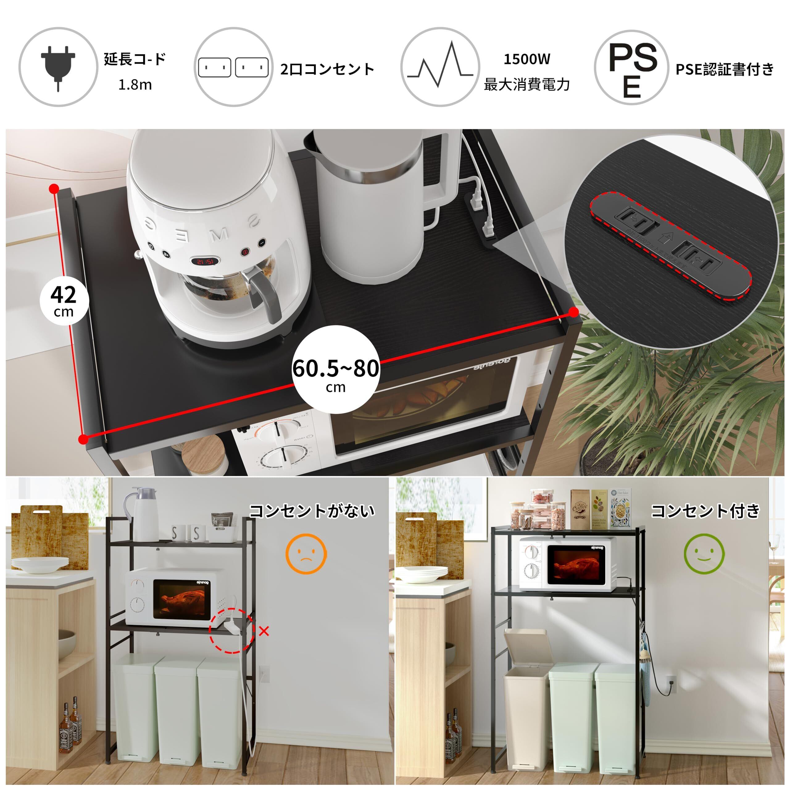 【オペレーション機能】2口コンセント付き、レンジ台やプリント台を置くときに便利です。そして幅が60.5から80までサイズを調整できるため、様々な空間で使用しやすくなっています。
