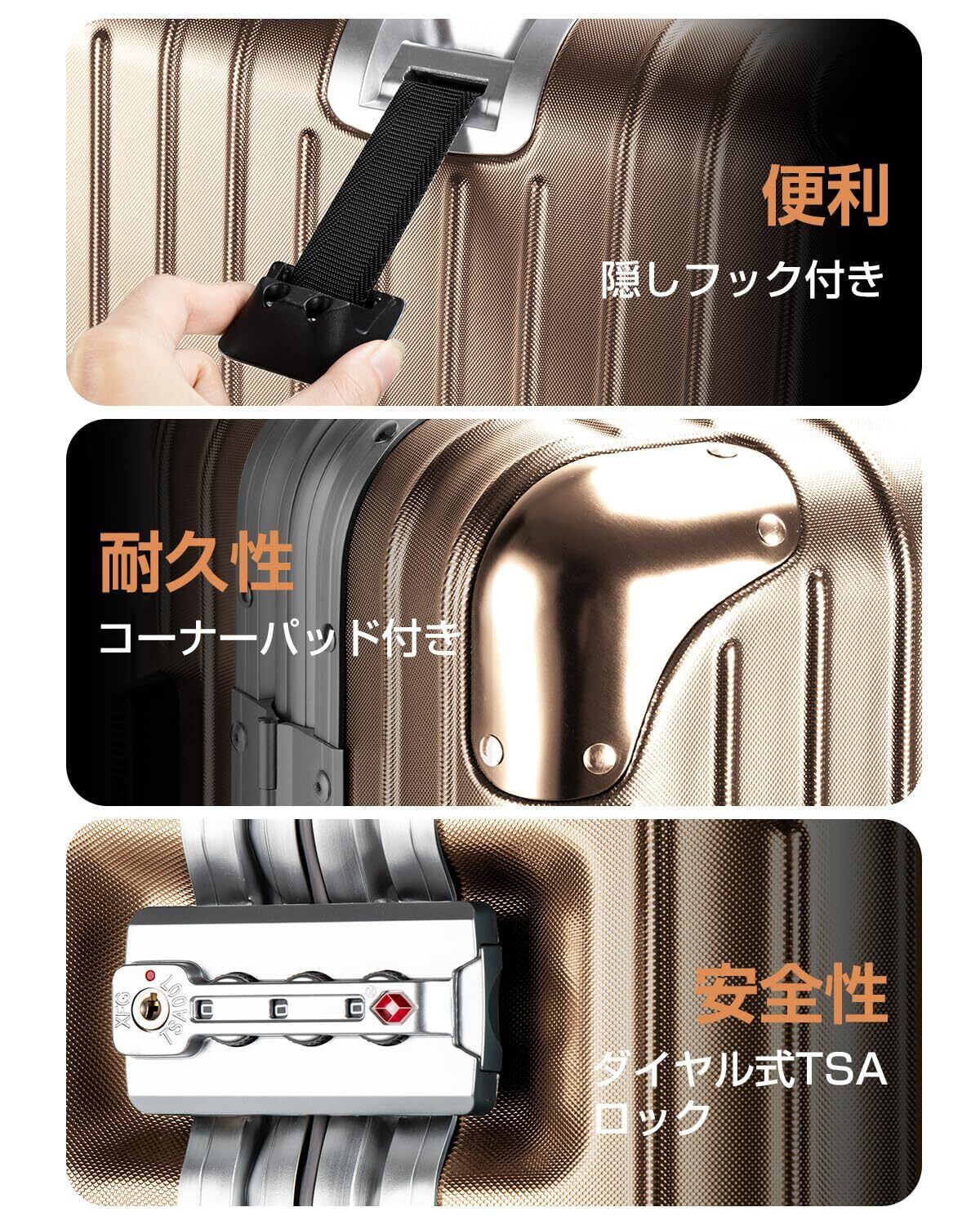 【改良されたアルミフレーム&ボディー素材】スーツケースは強化アルミフレームを採用し、従来のファスナータイプに比べ、高級感があって頑丈です。また、スーツケース本体の形状維持を強化させ、耐衝撃性と耐久性を向上させます。ボディーはABS樹脂とPCの混合素材で作られ、耐衝撃性に優れています。エンボス加工を施し、傷つきにくいです。