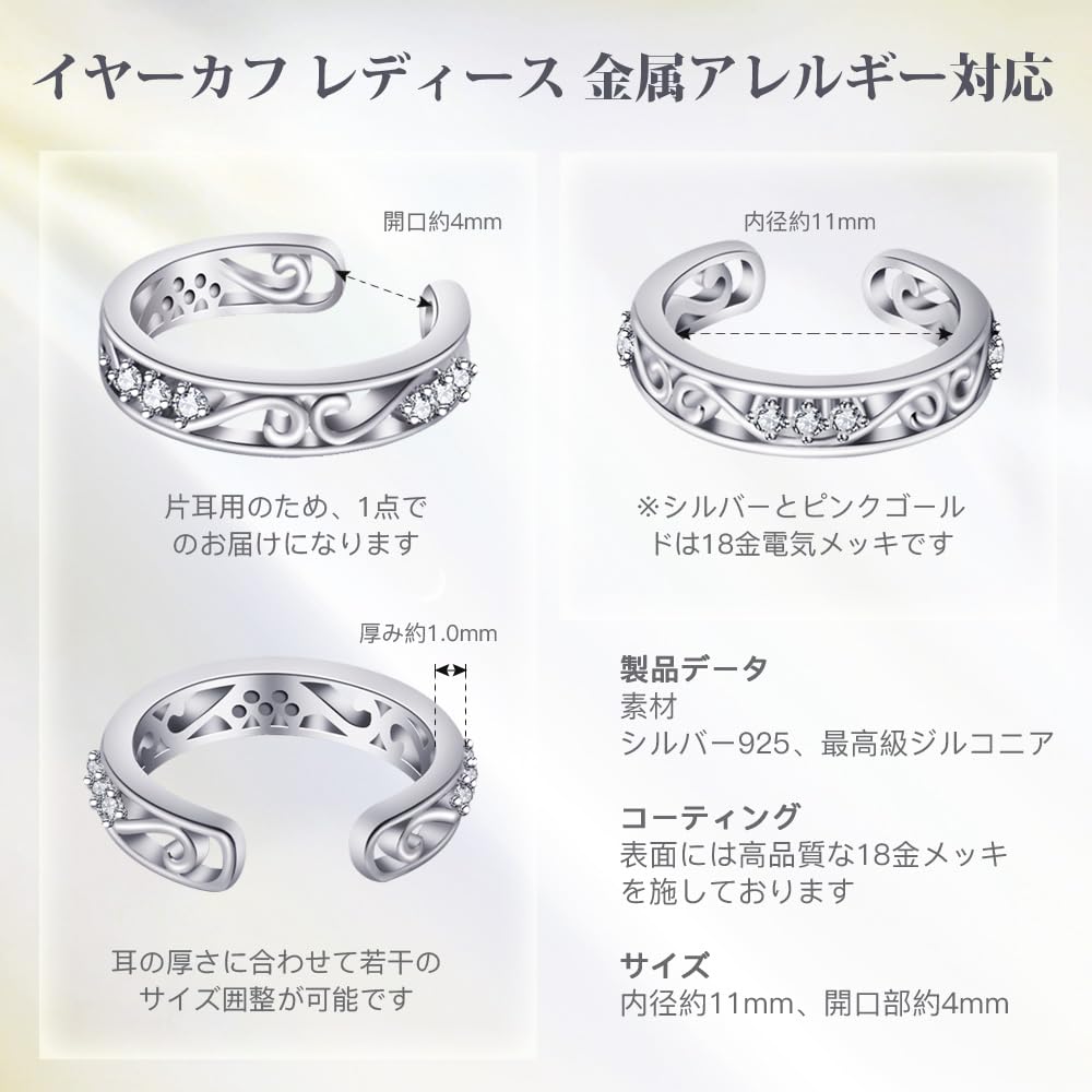 【商品詳細】イヤーカフは片耳販売。レディースイヤーカフ内径:約11mm。石:最高級ジルコニア。金属素材:シルバー925。シルバー925フェイクピアスは耳にフィットするタイプなので、イヤリング金属アレルギー対応のない方でも簡単に装着でき、レディースイヤリングピンクゴールドやメンズノンホールピアスと重ね付けしたり、お好きな位置に置いてお楽しみいただけます