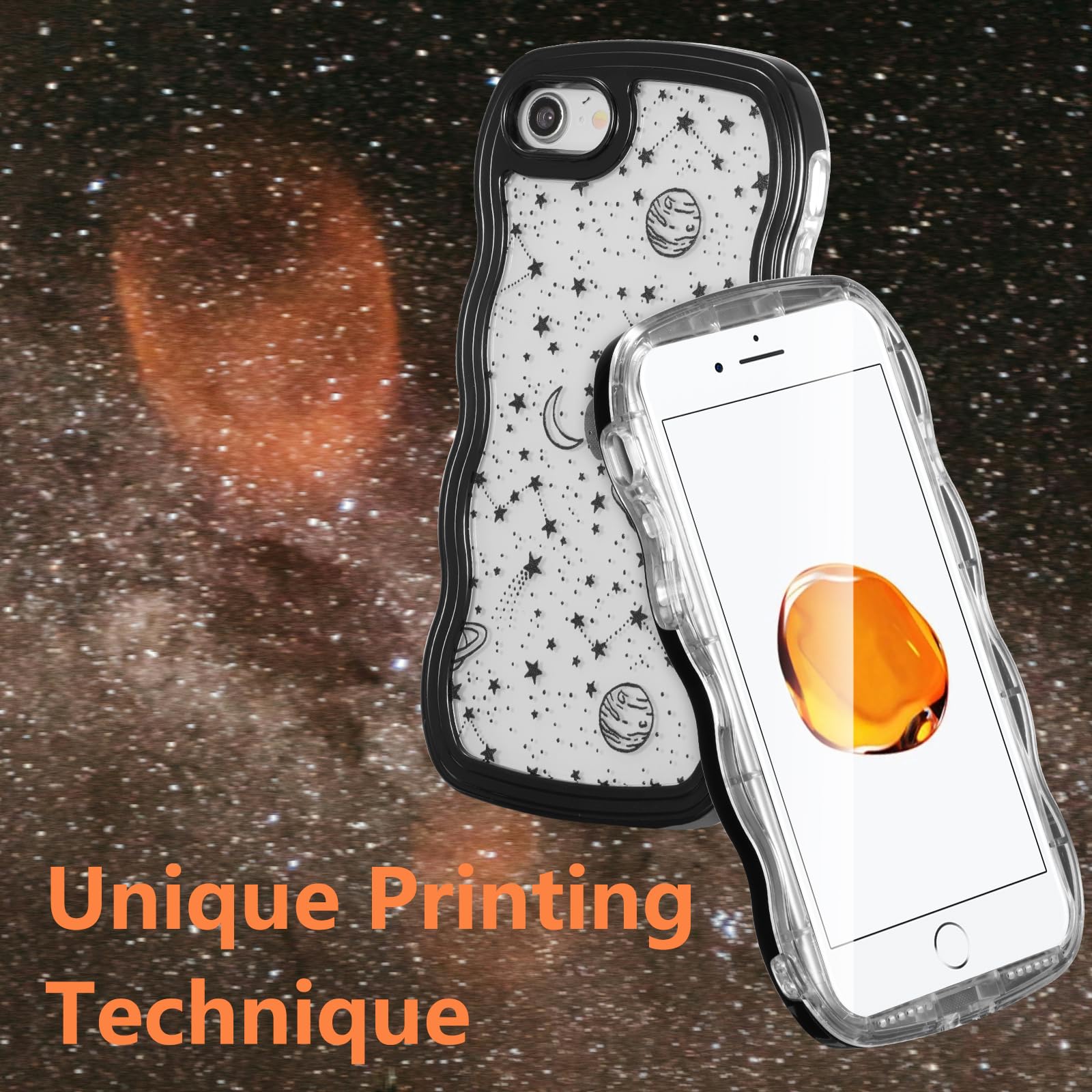 ZTOFERA iPhone SE3 / SE2 用波状のケース おしゃれ iPhone 7 クリアケース 人気 韓国 女子 アイフォン 8 ウェーブケース かわいい プラネット スカイ 星 月 宇宙 スマートケース 軽量 耐衝撃 ハード PC ソフト TPU バンパー ケース 画面レンズ保護 透明 携帯カバー (ブラック)