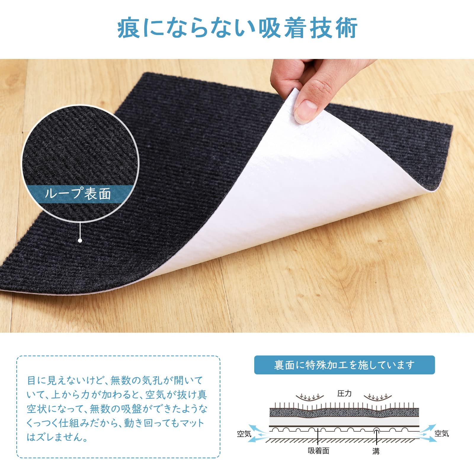【ずれない 吸着タイルカーペット】空気が抜け真空状態になって無数の吸盤ができたようなくっつく仕組みだから、動き回ってもマットはズレません。厚み約4mmのマットですので、つまずきにくく、扉の開閉の妨げにもなりません。引っ掛かったりする恐れが少なくなる。高齢者や老犬は足腰が弱くなり、滑り止め対策として良いものです。