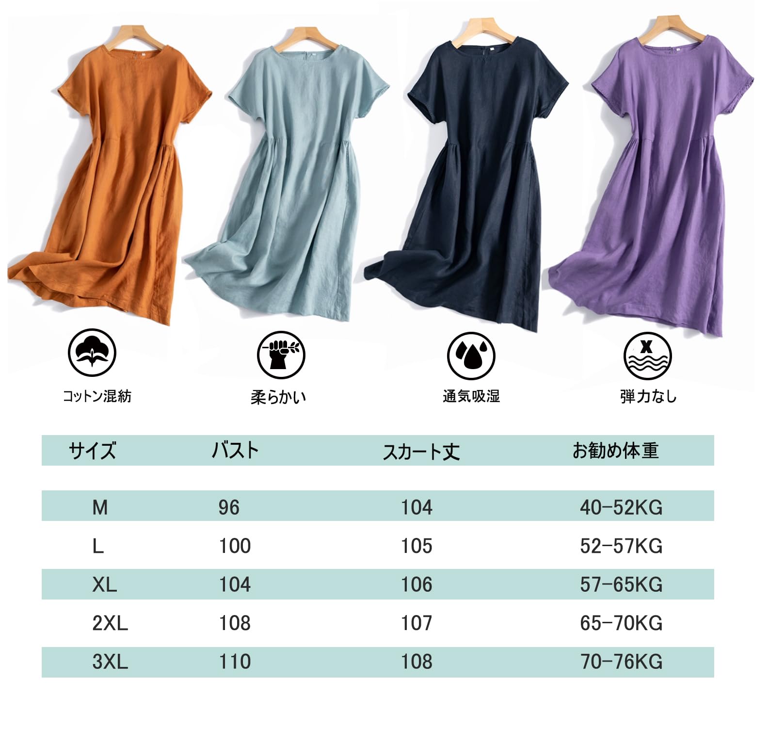 [BdeSYT] レディース 半袖 ワンピース マキシワンピ ゆったり ロング丈 綿麻混 体型カバー ナチュラル シンプル デート 着痩せ 森ガール 大きいサイズ 4色 夏 カジュアル 無地 M-4XL