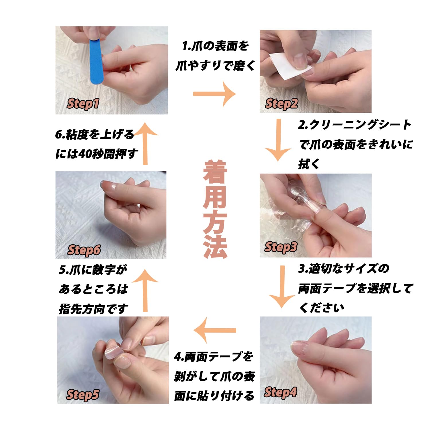 【貼り付け方】1.爪の表面を爪やすりで磨く。2.クリーニングシートで爪の表面をきれいに拭く。3.適切なサイズの両面テープを選択してください。4.両面テープを剝がして爪の表面に貼り付ける。5.可愛いネイルチップを接着する。6.粘度を上げるには40秒間押す。7.仕上げた!