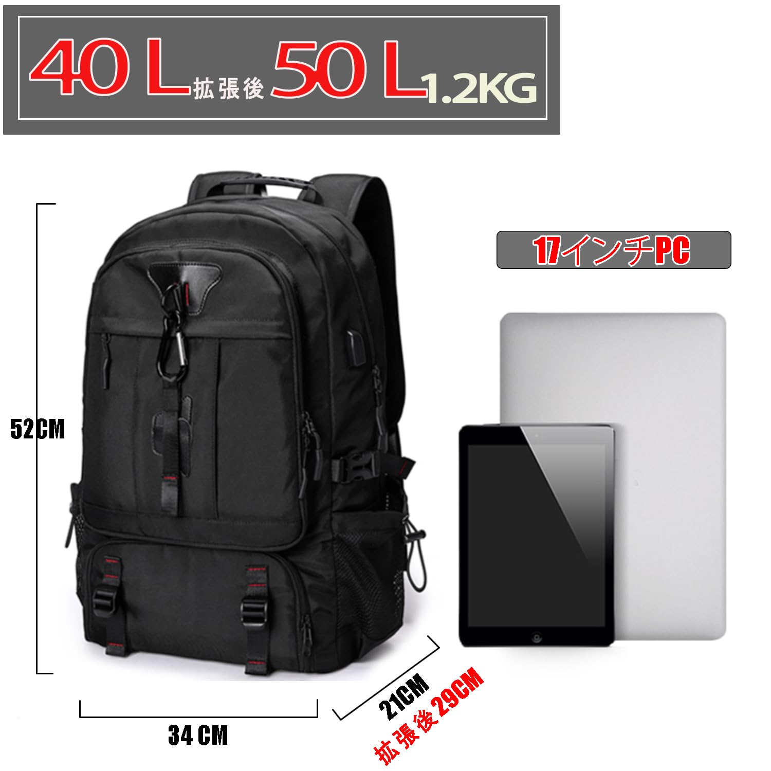 【収納力抜群】サイズ:約縦52cm × 横34cm × マチ21cm(拡張時29cm)、収納可能サイズ: 40-50L、重さ:1.1Kg。19個のポケットで使いやすさ抜群:最大17インチPC、Pad、A4サイズの書類や着替え、サングラス、帽子など必要なアイテムを、まとめて収納。キャンプや登山道具、旅行なら3~5泊分の荷物が余裕で入り、タウンユースだけでなく、非常時持ち出し用の防災リュックとしても十分ご活用いただけます。