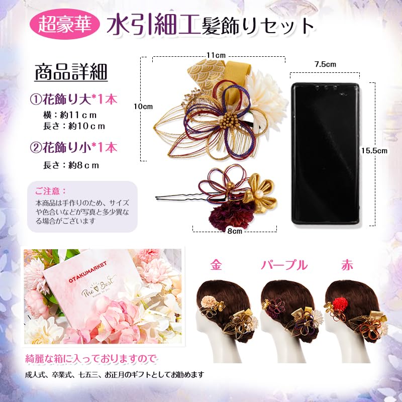 【成人式髪飾りのご注意】商品は手作りのため、サイズや形状位置の差異 、色や柄の出具合、曲がり、厚み、幅等のばらつきなどが写真とと多少異なる場合がございます。予めご了承下さい。