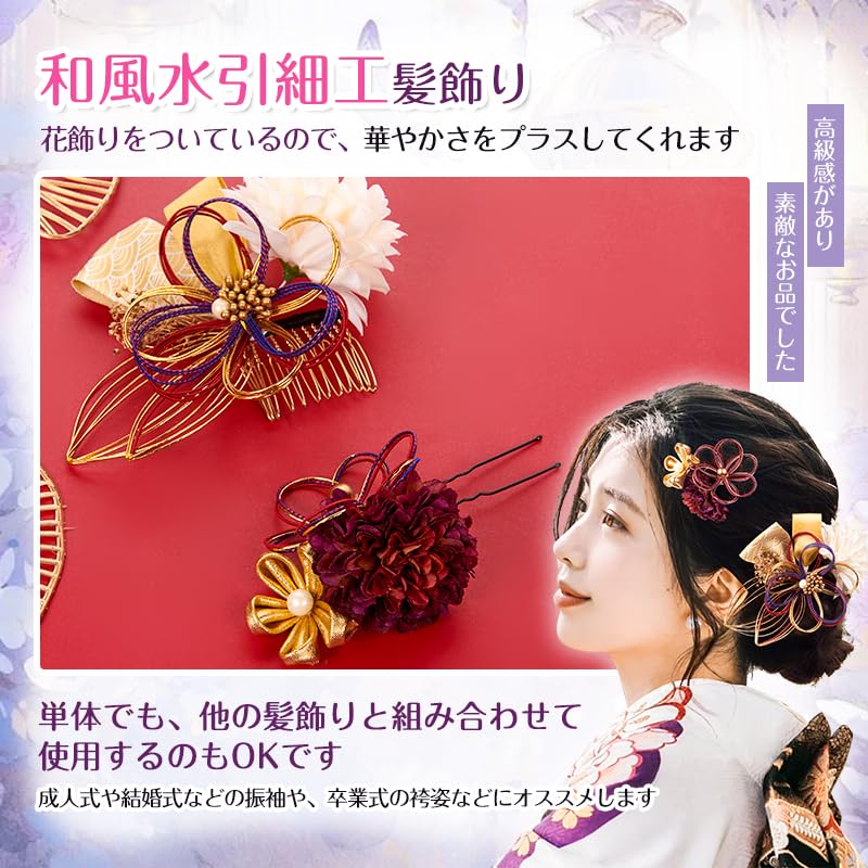 【着物髪飾り用途】水引きの髪飾りです。成人式の髪飾りは前撮りに最適。夜会巻き、アップヘア、サイドアップ、お団子、編み込みなど人気のまとめ髪の補助やアクセントにオススメです。大人の方は結婚式、パーティー、謝恩会、成人式、卒業式など華やかなお席の和装、振袖姿や浴衣のコーディネートにぴったりします。お正月、お祝い事、桃の節句、七五三、卒園式などにオススメです。
