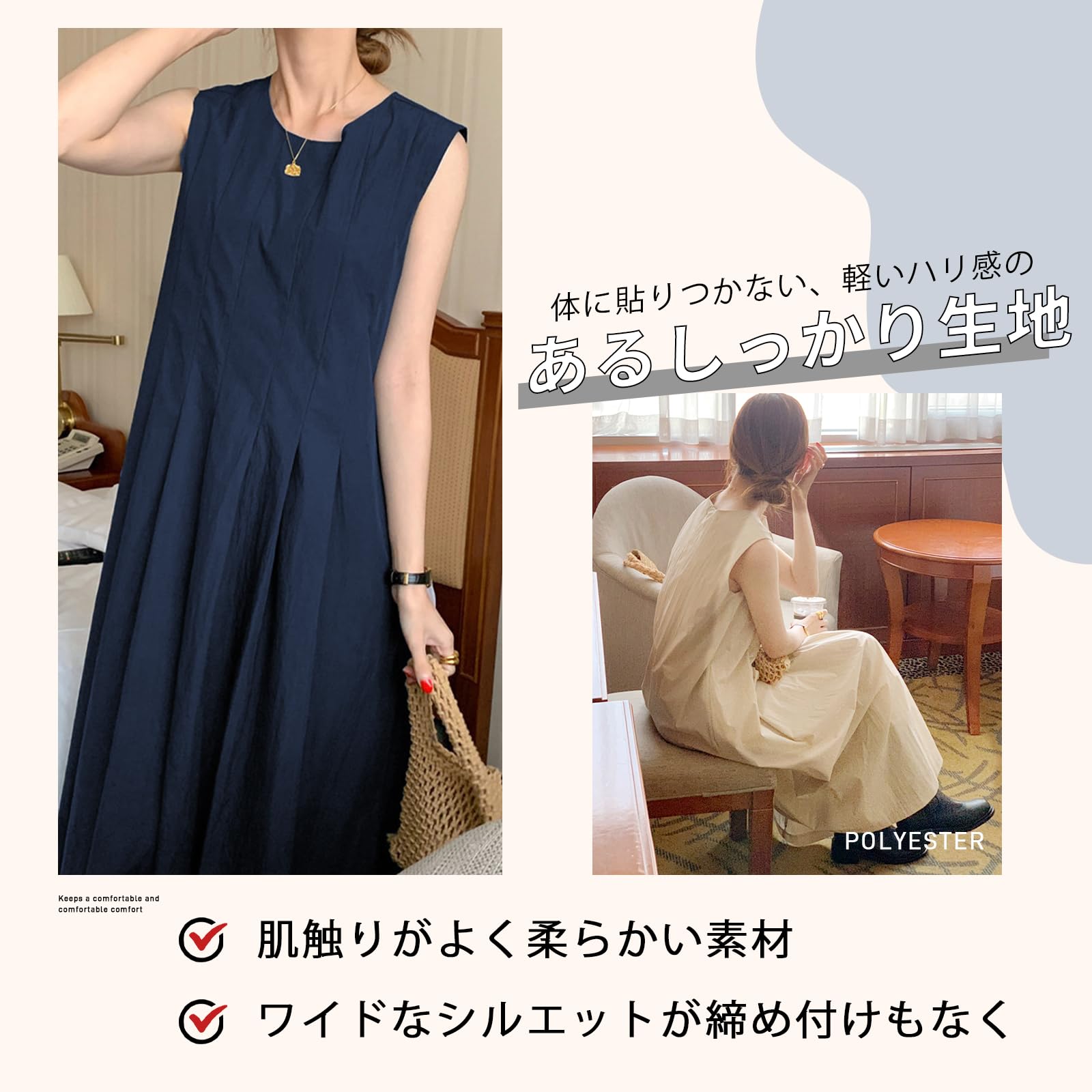 [Guooryvner] グオーリーブナー ワンピース レディース ロングワンピース 夏 春 ノースリーブ aライン プリーツ 大きいサイズ かわいい カジュアル 夏服 マキシ丈 オフィス ゆったり きれいめ 綿 ロング 着痩せ 体型カバー 通勤 韓国