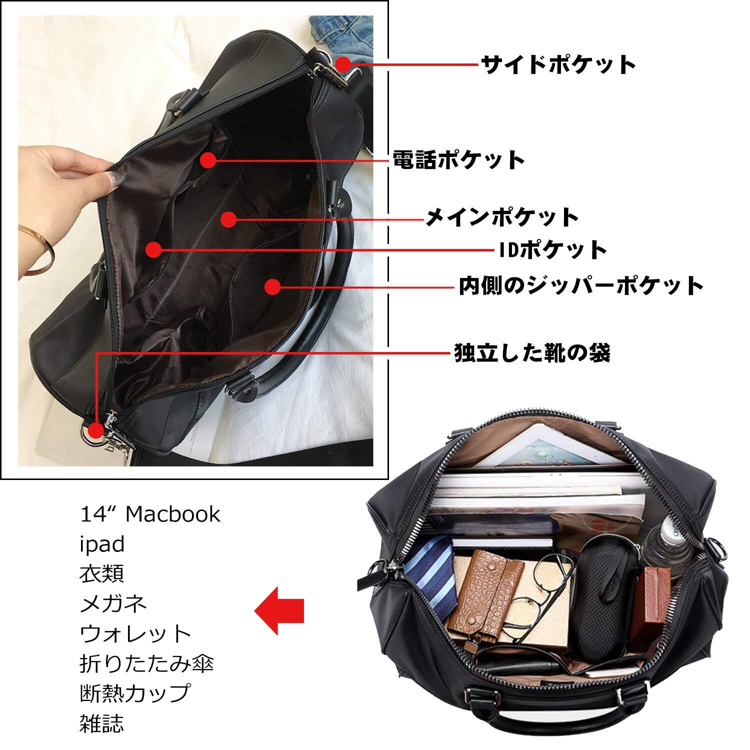 多機能ボストンバッグ:用途が広い,折り畳み可能。旅行先で荷物が増えてもこのバッグさえあれば安心です。旅行以外にも、通勤、通学、出張、ジム通いと様々な用途でお使いいただけます。
