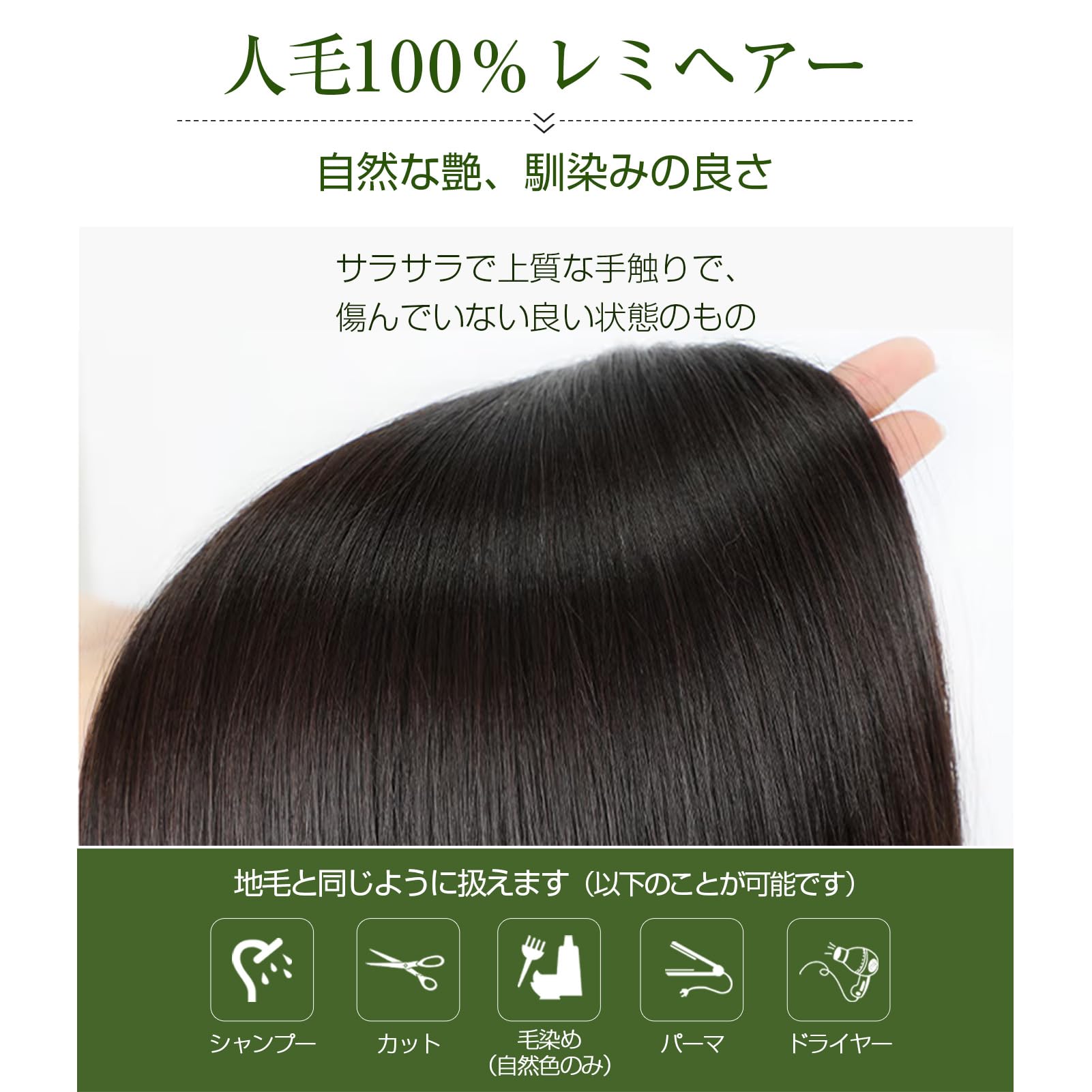 人毛100%レミーヘア:レミーヘアとは、毛髪のキューティクルが整った状態で残されている高品質な人毛のことです。これにより、髪の手触りが非常に滑らかで、自然なツヤと柔らかさを持ち、本物の髪のような質感を実現します。