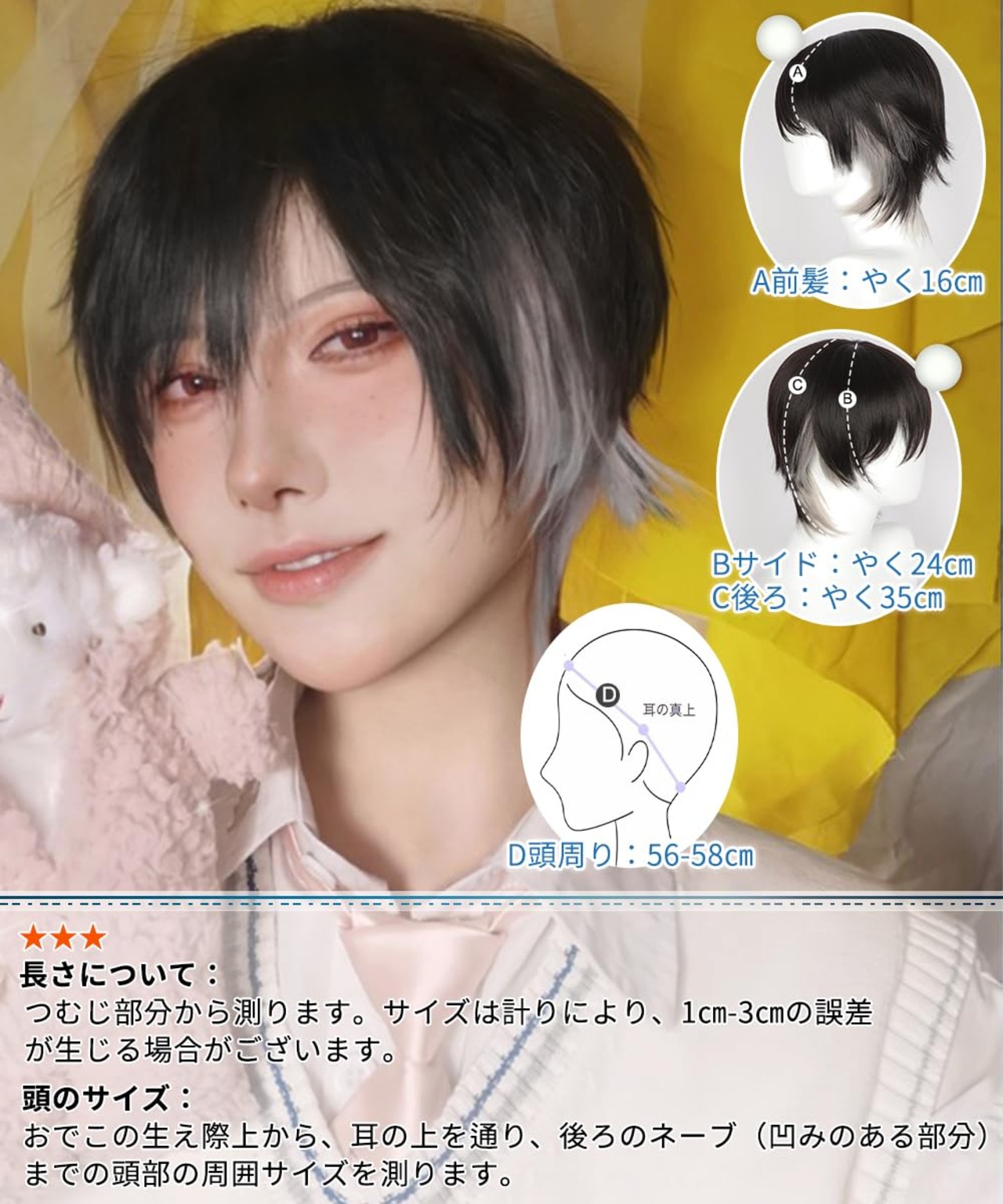 【商品情報】①カラー:黒髪/グレー。ほどんどの肌色に適合します。 ②タイプ:カジュアルショートカツラ。 ③素材:耐熱ファイバー。160 ℃までコテ、アイロン使用OK。 ④裏側:バラメッシュネット。 良好な通気性と弾力のあるバンドを使用、着用し最適! ⑤アジャスター付き:フック式で、頭周りにあわせて段階調節可能(頭周り:約56~58 cm)。