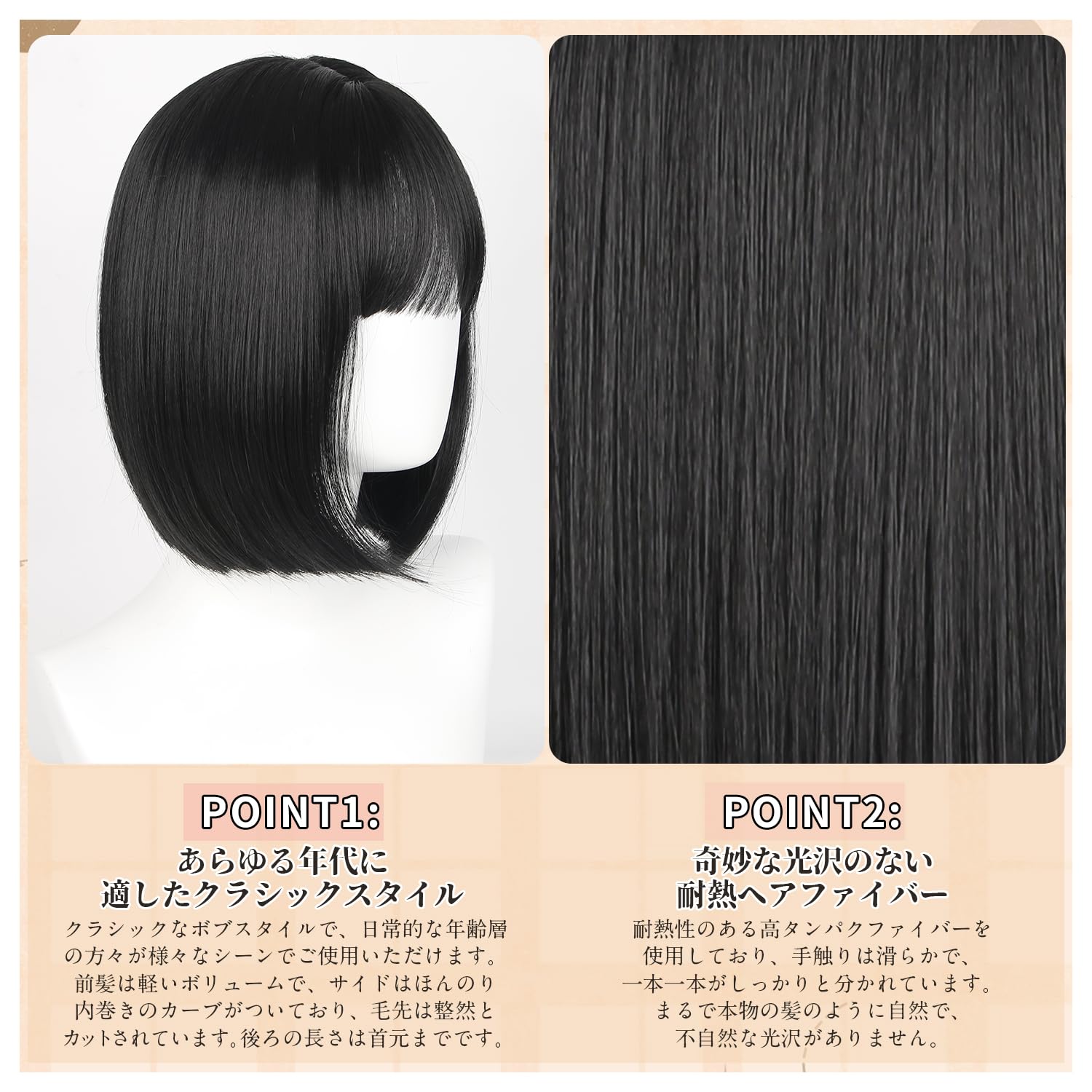 【カラー】人の毛の髪色に合わせやすいナチュラルブラック。キュートなボブスタイル、小顔効果抜群。前髪は軽くて空気がたっぷり入っていて、全然蒸れないんです。