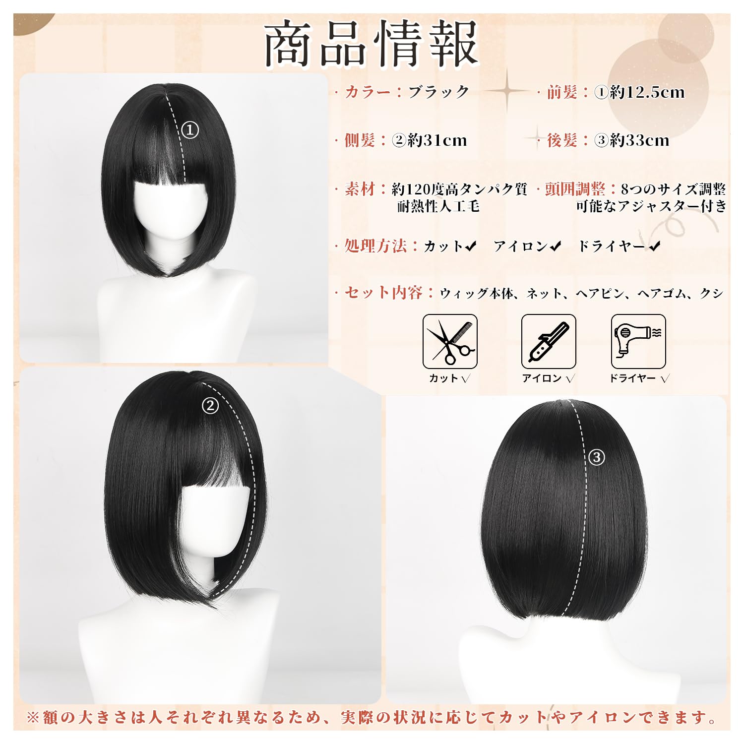 【サイズ】アジャスター付き、最大頭周り約55cm、8のサイズ調整可能ですよ。前髪:つむじから約12cm 後ろ髪:つむじから約32cm(手動測定のため、1~2cmの誤差が生じる場合があります)