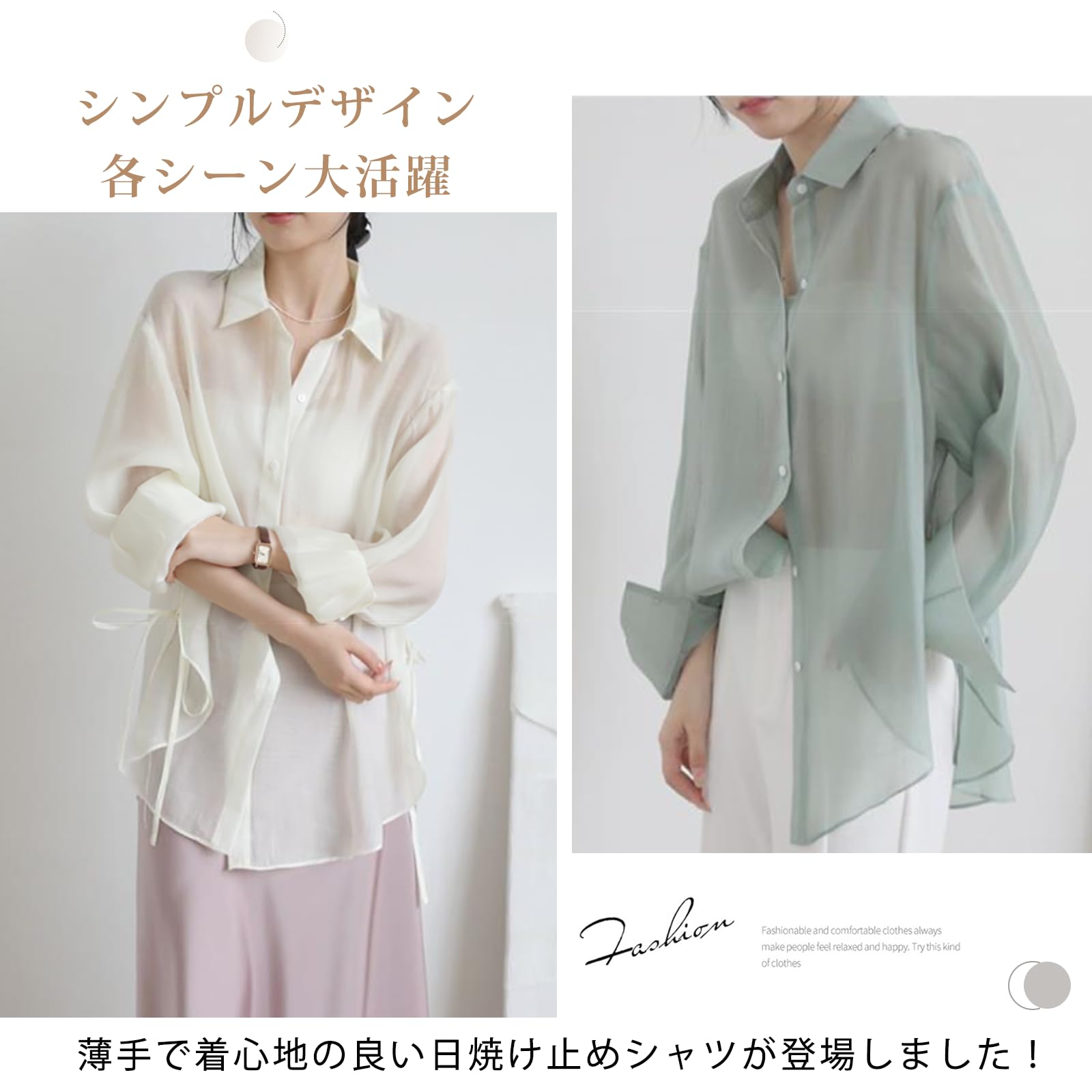 薄手のシフォン素材は通気性があり、軽やかな着心地を提供します。暑い季節でも快適に過ごせます。長袖のデザインで、肌の露出を減らしつつ、涼しく過ごせます。袖口をロールアップして着ても女性らしさをプラスして知的な印象を与えてくれます。紫外線の強い秋や春~初夏にかけて、長く使えちゃうアイテムです。一枚あると、肌寒いときや、エアコンの効いた室内など、さっと羽織れて重宝しますシャツ。