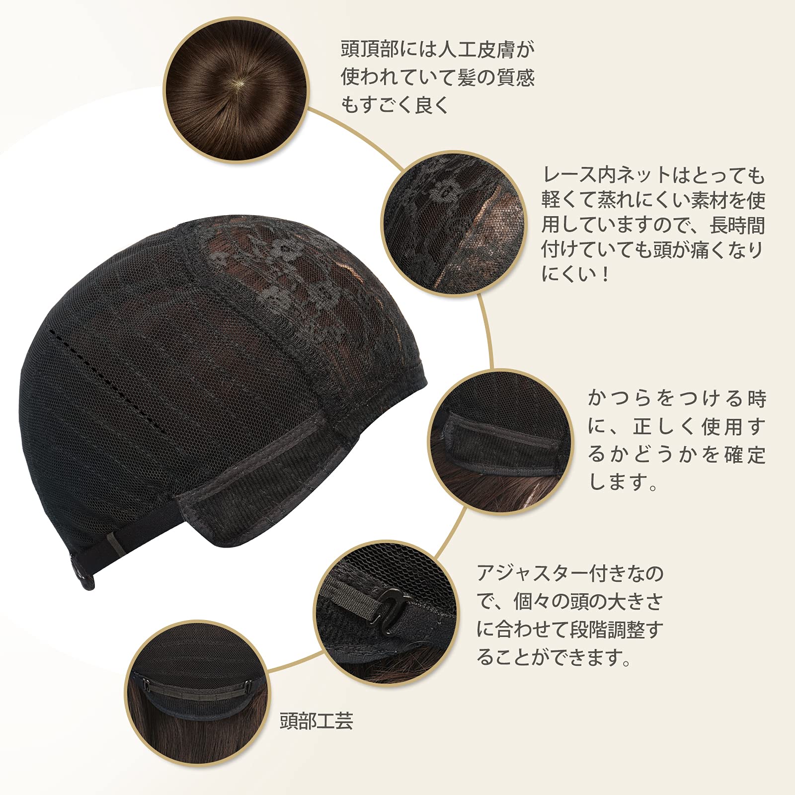 サイズ:フリーサイズ (頭周約56cm・サイズを調節できるアジャスター付き)前髪:つむじから約18cm 後髪:つむじから約28cm 重さ:約93g