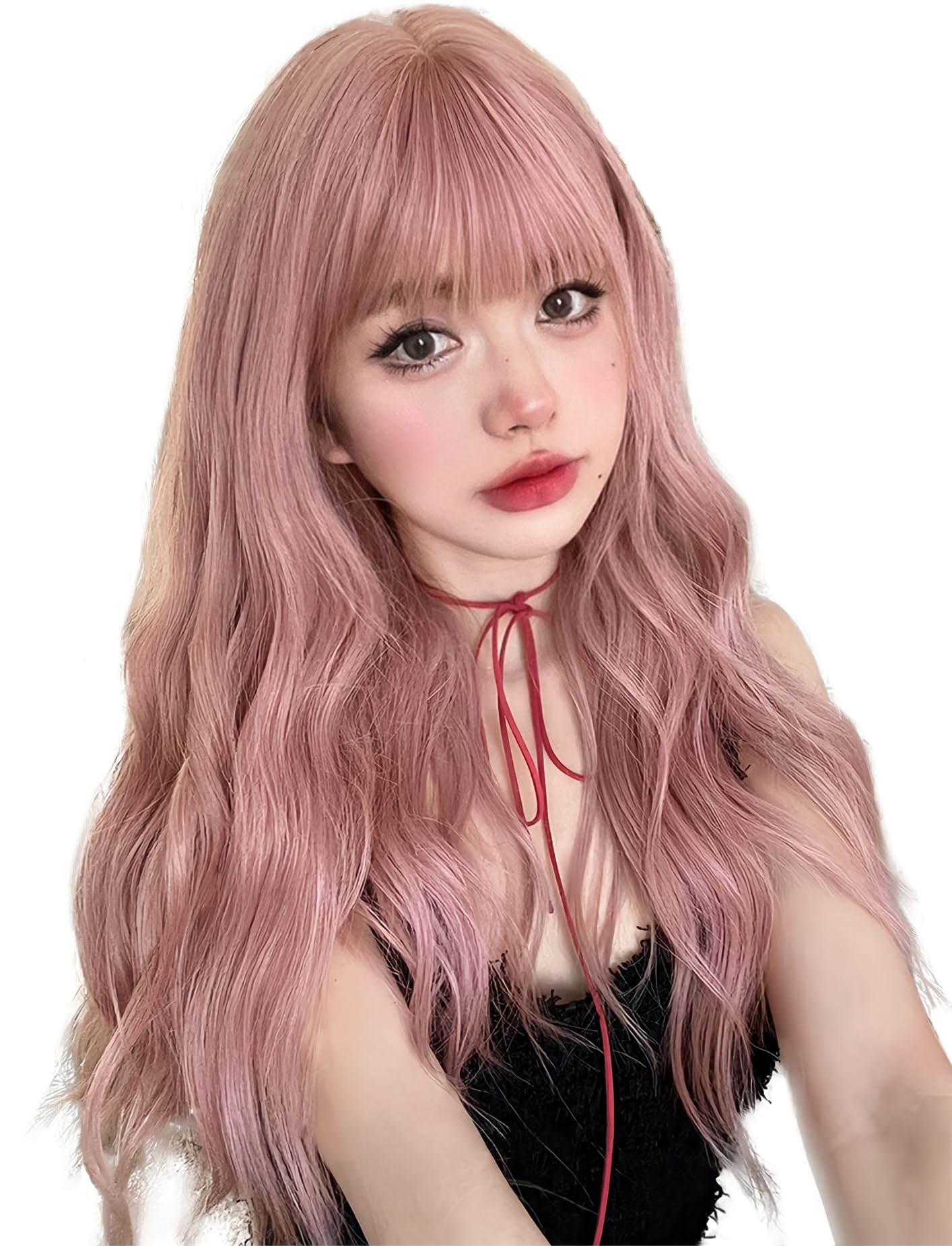 Limakaraウィッグ ロング 巻き髪 自然 フルウィッグ ナチュラルロング レディース カール 女装 ウェーブ ぱっつん前髪 かつら ロリータ コスプレ wig ファッション 耐熱 小顔 日常 原宿系 人気 地雷系 ネット/櫛付き アッシュピンク | Bloomia